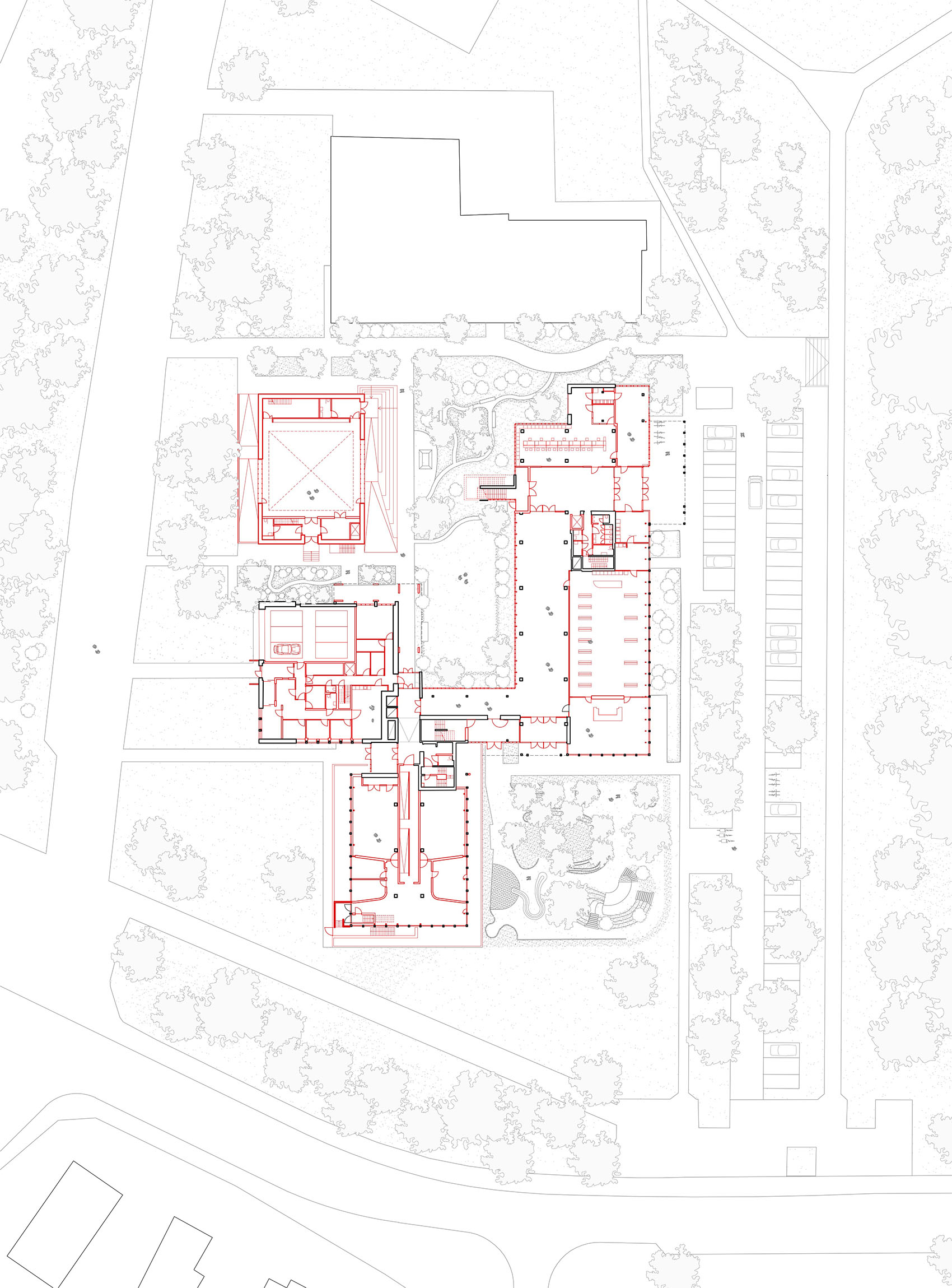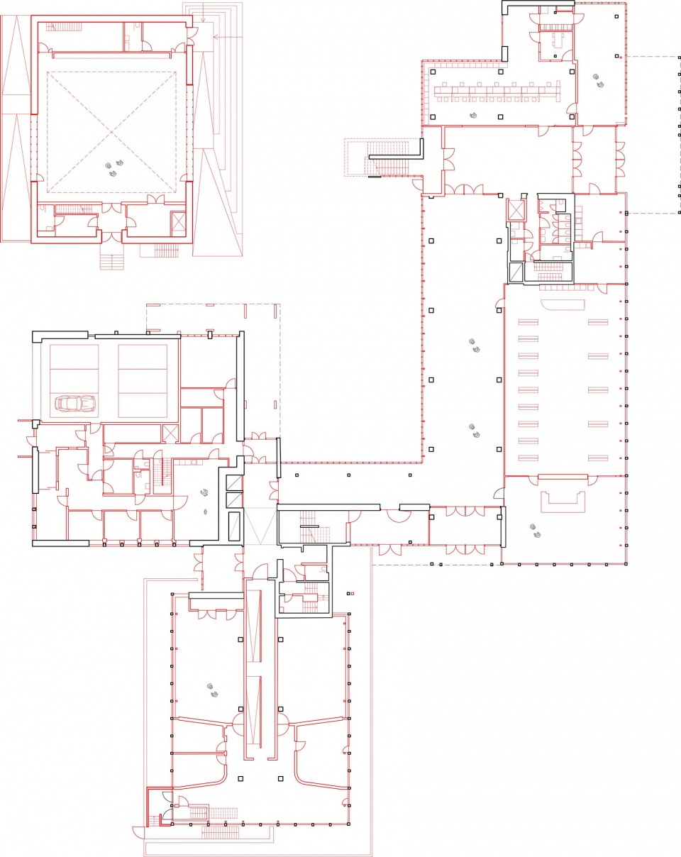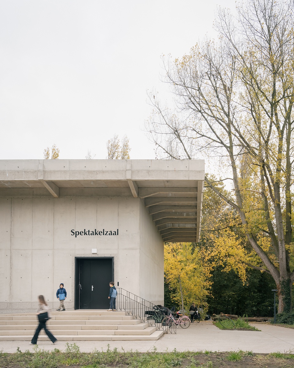 根特布吕赫服务中心由Paul Felix设计,坐落于根特布吕赫梅尔森(Gentbrugse Meersen)边缘,由三栋建筑组成。这三栋建筑通过精心组织的构图彼此相连,使每一栋既保持自身的独立性,又能够与其间所形成的空间产生互动。此次改造通过一系列干预措施,将场地的属性从一座行政办公建筑转变为一座以不同使用者之间相遇与交流为核心的城市性建筑。每栋建筑顶部均加建了扩展空间,包括舞蹈厅、办公空间以及屋顶游乐场。在建筑内部,所有功能空间均直接面向公共流通空间布置,并以其为组织核心。图书馆作为首层的核心枢纽,周围环绕着开放式服务柜台,促进不同使用者之间的互动。演出大厅作为第四栋建筑被增建以完善整体构图,并与相邻建筑共同围合出一个庭院。