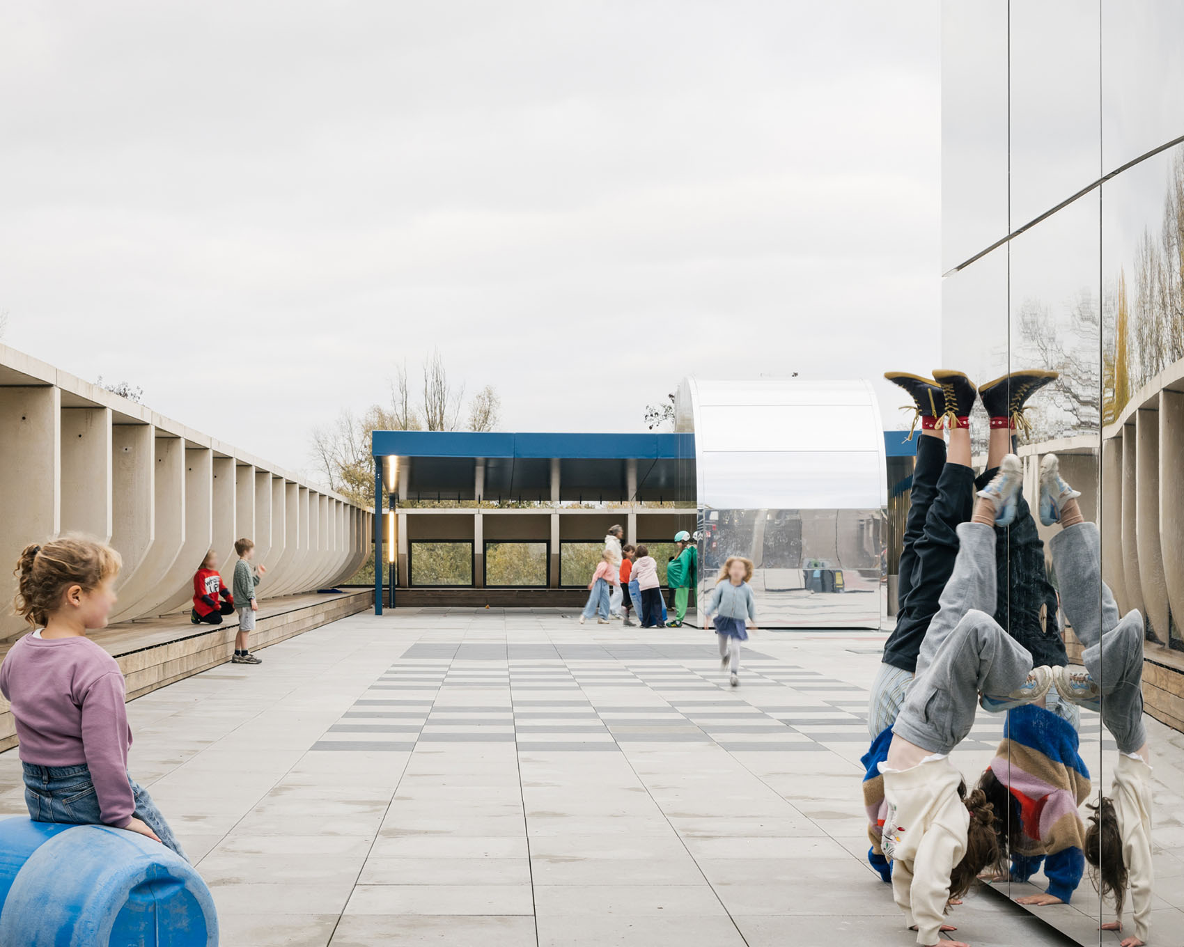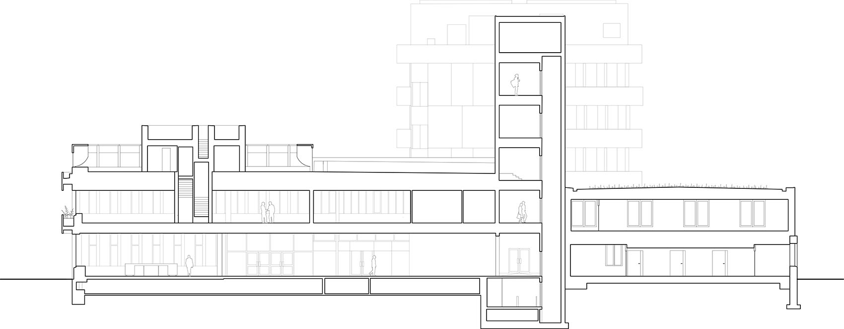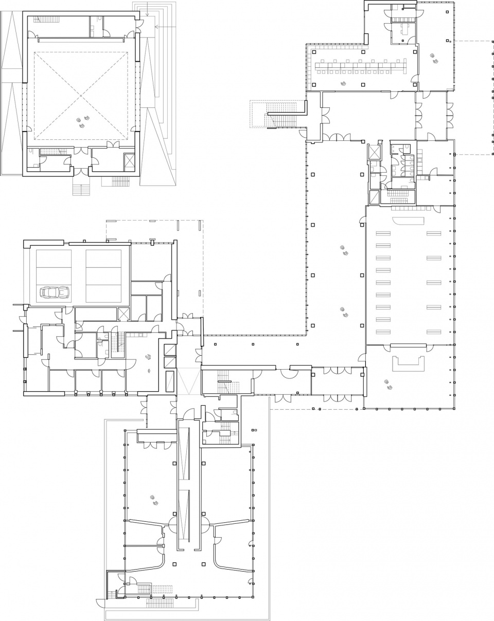 根特布吕赫服务中心由Paul Felix设计,坐落于根特布吕赫梅尔森(Gentbrugse Meersen)边缘,由三栋建筑组成。这三栋建筑通过精心组织的构图彼此相连,使每一栋既保持自身的独立性,又能够与其间所形成的空间产生互动。此次改造通过一系列干预措施,将场地的属性从一座行政办公建筑转变为一座以不同使用者之间相遇与交流为核心的城市性建筑。每栋建筑顶部均加建了扩展空间,包括舞蹈厅、办公空间以及屋顶游乐场。在建筑内部,所有功能空间均直接面向公共流通空间布置,并以其为组织核心。图书馆作为首层的核心枢纽,周围环绕着开放式服务柜台,促进不同使用者之间的互动。演出大厅作为第四栋建筑被增建以完善整体构图,并与相邻建筑共同围合出一个庭院。