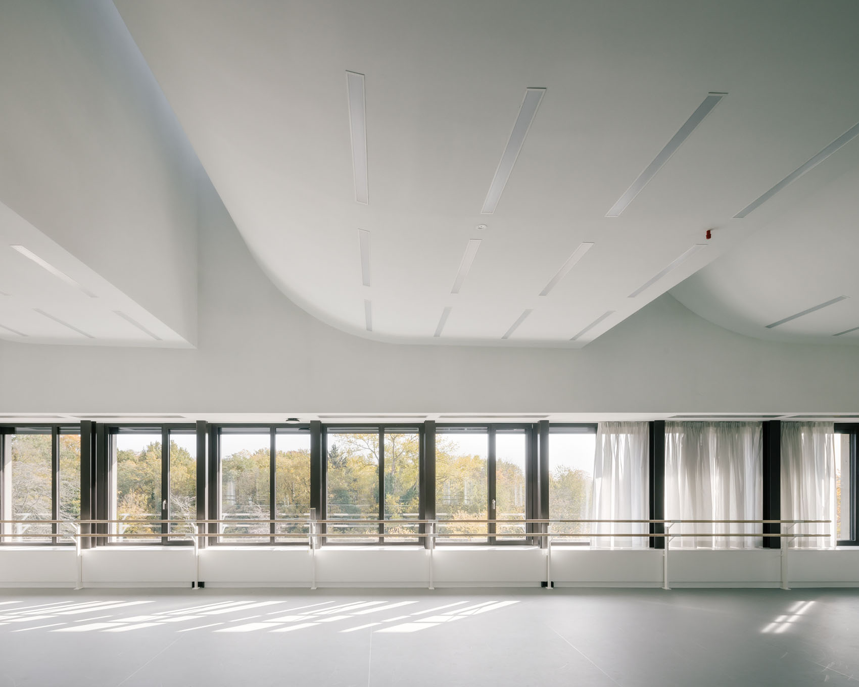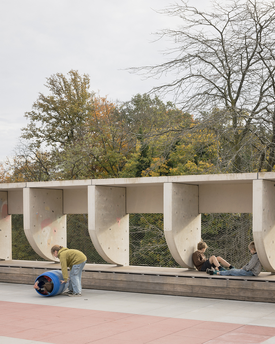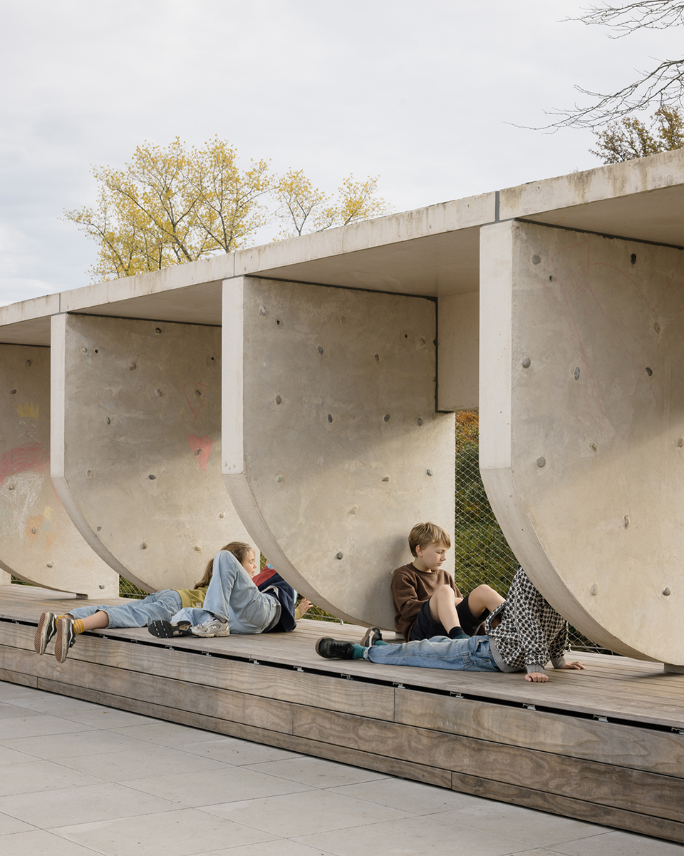 New concrete facade elements are arranged in a rhythm that aligns with the existing building’s cadence. The slender panels curve according to a tectonic logic that embodies the new construction phase. The design puts radical trust in the accommodating and generous spaciousness that the buildings offer, and extends it into a new ensemble.