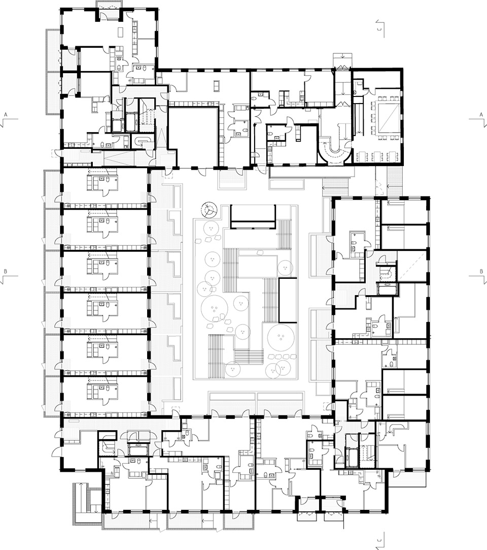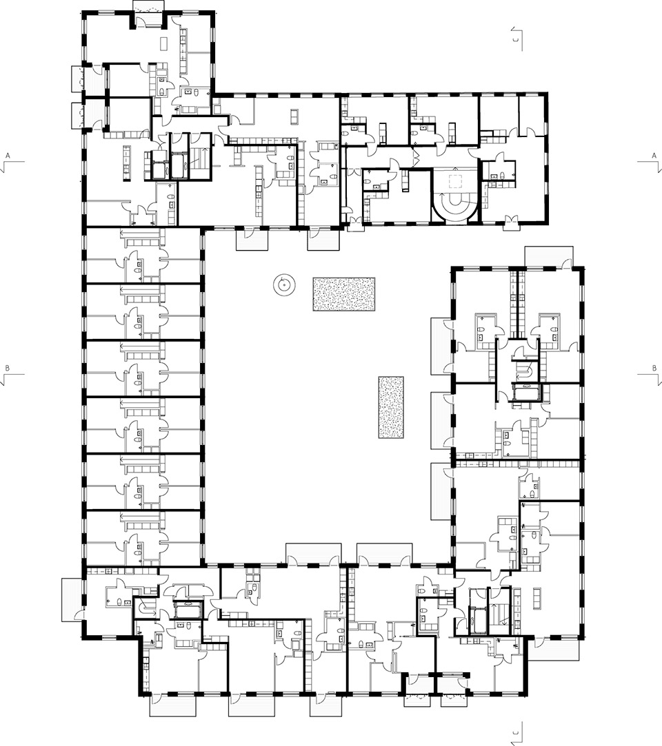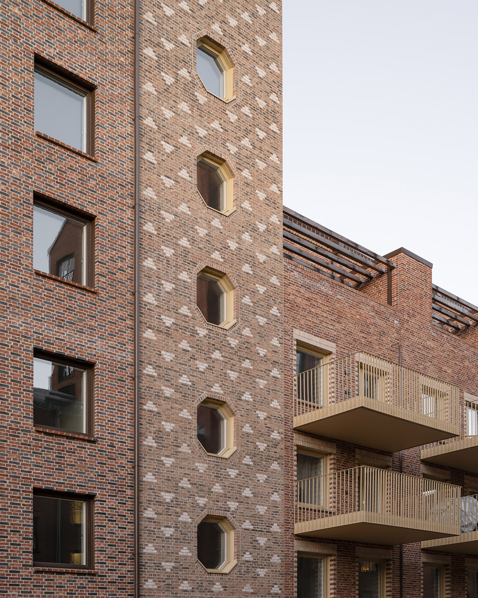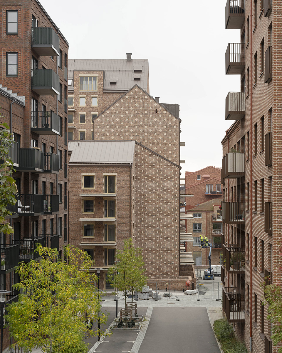 The Spanjoletten project is rooted in the area’s industrial history. With close proximity to Klippan’s 19th-century brick buildings, the project is a reinterpretation of the rich and light-hearted brick architecture found in the nearby harbor area. Varying building heights within the block, framed by characterizing solid gables, create urban spaces almost like interior rooms. This experience is enhanced by the treatment of the brick facades forming wallpaper like patterns.