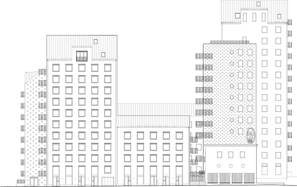 Spanjoletten项目植根于区域的工业历史。毗邻克利潘(Klippan)19世纪的砖建筑群,项目对港口周边丰富而富有活力的砖建筑风格进行了当代表达与再诠释。街区内部通过变化的建筑高度与标志性的实体山墙围合,营造出近似室内空间般的城市场所感。砖立面的处理则形成类似墙纸图案的纹理,进一步强化了这种空间体验。