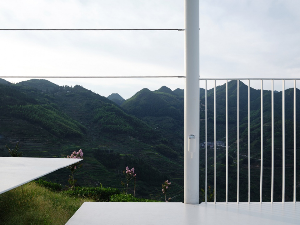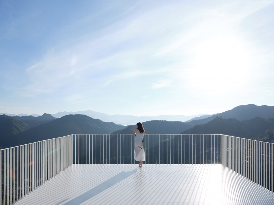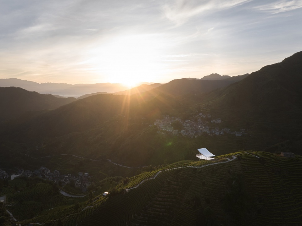 The site lies approximately thirty kilometers from Songyang’s urban center, within the Organic Tea Valley of Xinxing Town, Songyang County, Zhejiang Province, occupying the summit of a terraced tea mountain. Songyang is a significant tea-producing region in southwestern Zhejiang, where tea gardens and villages are interwoven across mountain valleys, and tea rows, field ridges, and picking trails compose a continuous agricultural landscape. The site commands open views of rolling tea mountains in every direction, with mist occasionally rising from the valley floor. Originally accessible only by narrow field paths, the steep terrain bore no existing structures. The design originates from a slender, hovering form — wing-like or leaf-like — that minimizes physical impact on the terrain while maintaining unobstructed panoramic views. The ascending path follows and reinforces existing tea-picking routes. Granite steps wind upward through the terraces, guiding visitors toward the pavilion while preserving the spatial logic of everyday agricultural practice. The architectural intervention thus emerges as an organic continuation of the cultivated landscape rather than its disruption.
