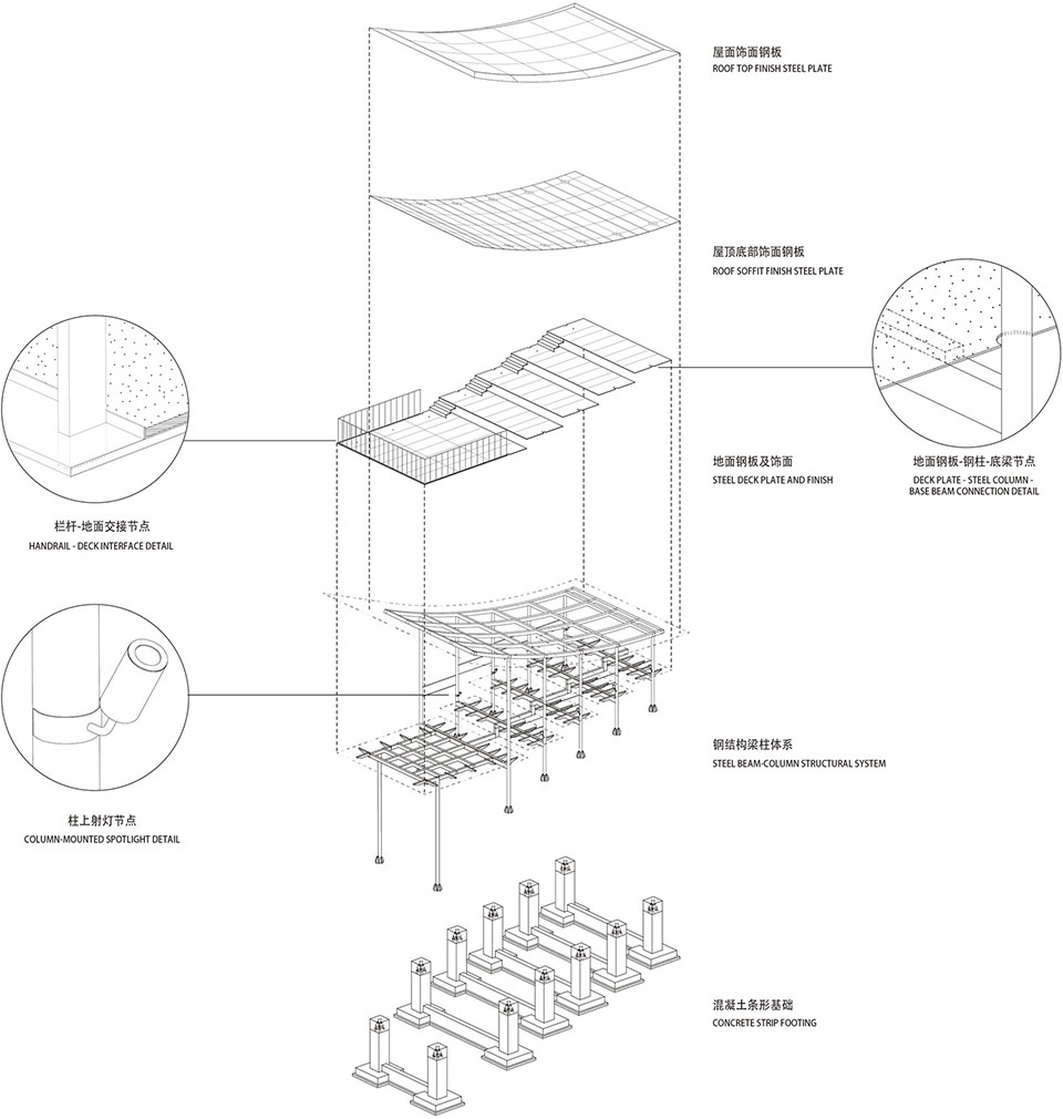 浮亭的结构设计以极致轻量化为目标。整体采用纤细的钢结构体系,屋面为薄型钢板复合夹芯构造:上下两层钢板之间嵌入网格排布的钢梁,形成受力高效的轻质屋盖系统。屋面边缘通过向下渐收的构造处理,将结构逻辑、排水功能与视觉控制整合为一体,有效压缩屋面的视觉厚度,使边缘轻盈锐利,宛如一片漂浮于茶园之上的薄翼。构造细部进一步强化“浮”的感知。平台底板仅由一根主横梁支撑,并通过楔形钢板加筋肋实现悬挑;平台边缘与竖向立柱刻意脱开,形成半圆形缝隙,使光影从底部渗透而出。柱间设置的纤细钢拉索在提供安全防护的同时,将视觉遮挡降至最低,保持亭体的通透性。