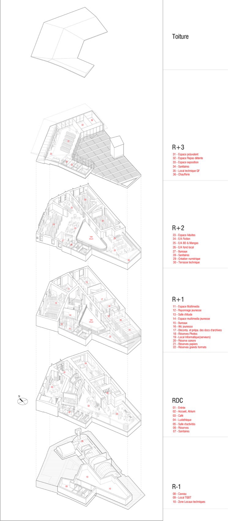 The creation of this cultural center is closely linked to the desire to find a functional facility, capable of bringing together the various services that are currently scattered around the town, and bringing them together to meet the needs of local residents. This age-old bastide, a magnificent medieval urban structure, is today a “priority” district, and the construction of this cultural hub represents the first step towards the renewal of Villefranche de Rouergue’s town center: a place capable of meeting the needs of everyone, especially the most disadvantaged, capable of disseminating, animating, welcoming and educating around knowledge and culture. So for us, this cultural hub is neither a library, nor a media library, nor a games room, nor a multi-purpose hall, nor an exhibition space, but all at once: today we could call it a “third place”, i.e., a place designed to accommodate a community so that it can freely share resources, skills and knowledge under one roof. With today’s sensibility, culture and needs, we propose an architecture in line with the history of this place. A journey through the ages, an opportunistic journey, based on the poetics of the situation.