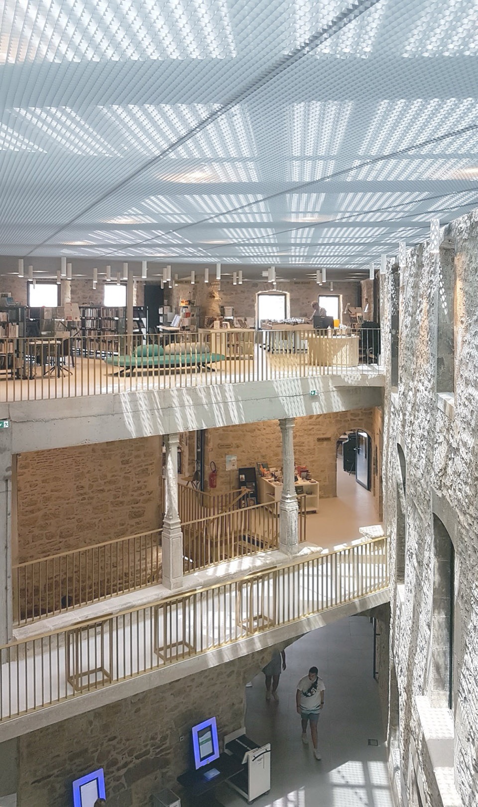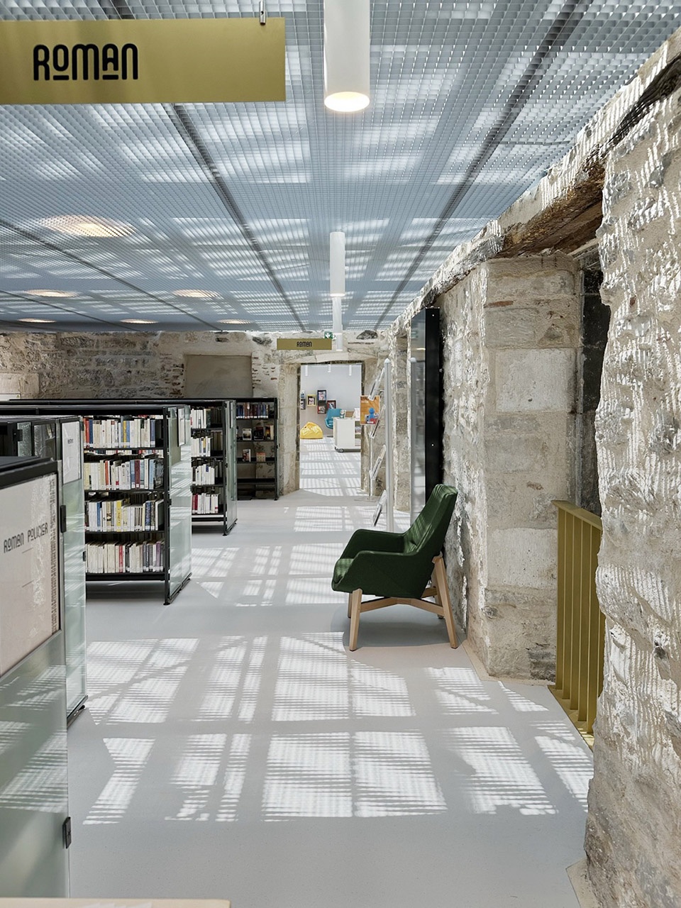 This level is entirely dedicated to the adult area. It’s a space with multiple ambiances between the old and new parts, revolving around the central atrium. The space is lit from above by a light roof of glass and steel, which filters the light evenly and softly. The roof is designed to avoid direct sunlight and overheating in the spaces. A digital fabrication workshop has been added since the competition, to enable multimedia tools to be learned. It is separated from the adult area by a glass and soundproof partition. A staff office allows staff to work and monitor this area of the library. Lastly, sanitary facilities accompany this area, avoiding the need to descend to the ground floor.