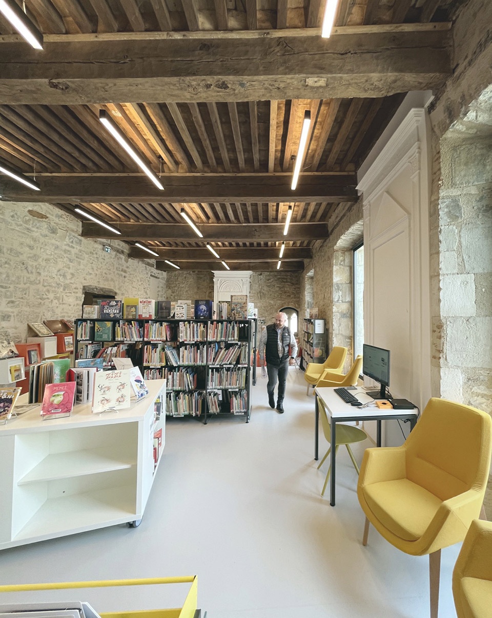 -The youth area is housed in a large room in the existing building overlooking Place B Lhez. This space is fitted with low furniture to distinguish the various sub-spaces, without altering the heritage aspect of the room. It is enhanced by an entertainment area opening onto the atrium and a staff office overlooking the youth areas. A washroom for children and adults is directly linked to the atrium.