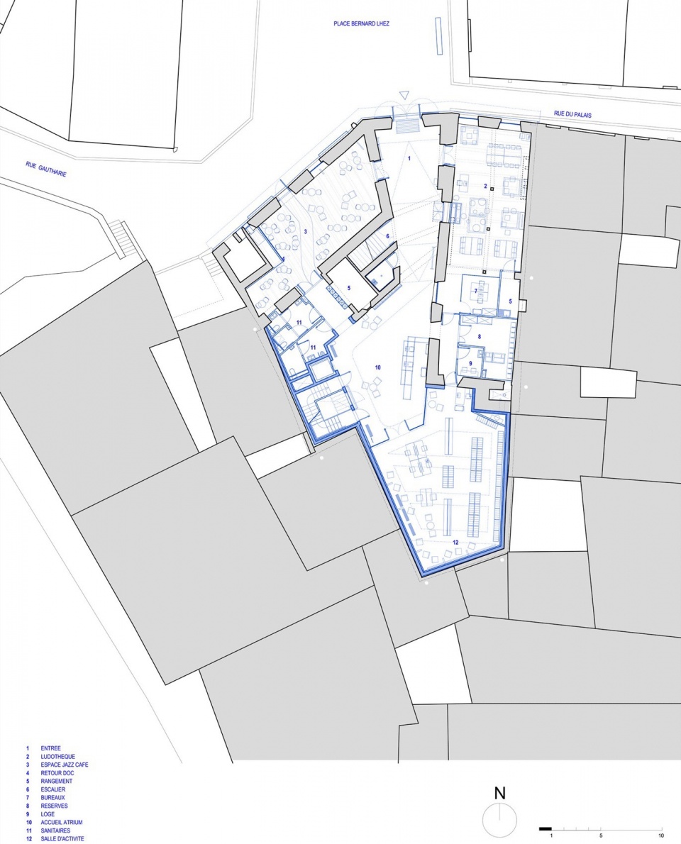 玩具图书馆 位于面向Rue du Palais的现有建筑中,提供大型空间,适合团体活动,并配有可俯瞰游戏区的玻璃办公室及储物区。