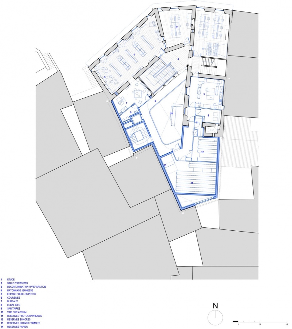 这一层完全用于成人区,是一个融合旧区与新区、多样氛围的空间,以中央中庭为核心。顶部采用玻璃与钢结构轻型屋顶采光,使光线均匀柔和。屋顶设计避免了直射阳光和空间过热。自竞赛以来,增加了数字化制作工作坊,便于学习多媒体工具。工作坊与成人区之间以玻璃隔音墙隔开。工作人员办公室可供员工办公并管理该图书馆区域。最后,卫生设施配套完善,无需下到一层。