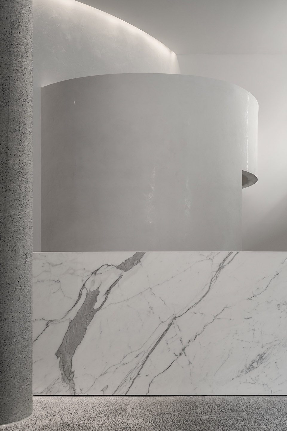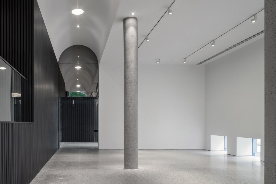 入口门廊通向一个拱顶双层高门厅,内部单色黑木墙引导游客穿过门厅和餐厅(波特 residence),前往既有的画廊空间。