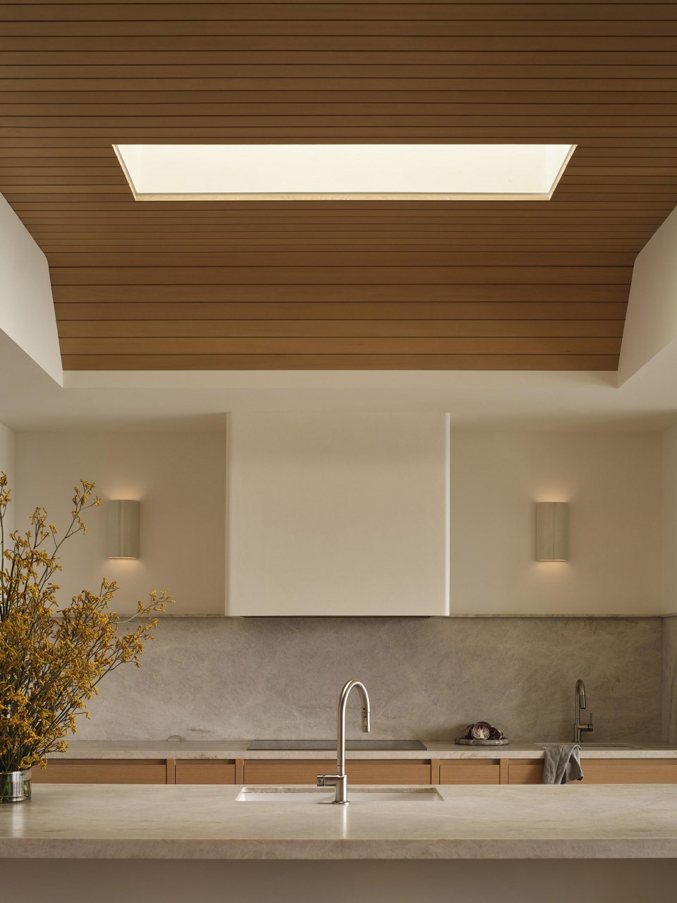 克制而统一的材料体系进一步强化了这种联系。白橡木、本地开采的石灰石、灰泥与亚麻共同构建出中性色调的基底,并叠加温暖的细节层次。柔和的海岸色彩呼应岸线不断变化的肌理,自然材质的运用为空间注入深度与柔和感。最终呈现的是一处既具当代气质,又拥有恒久品质的住宅——宁静、富有触感,并与环境紧密相连。