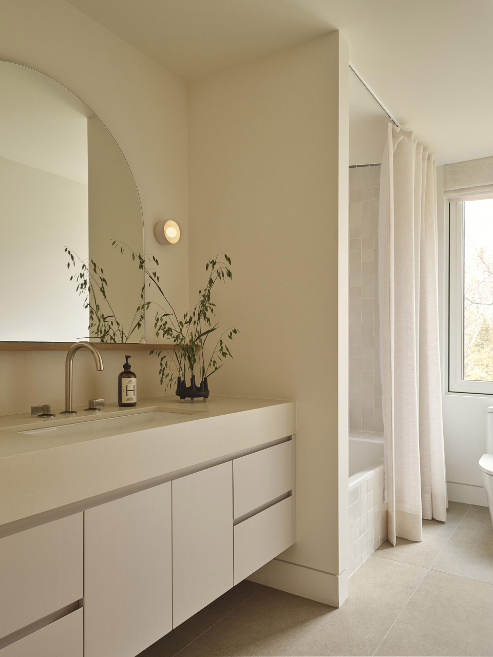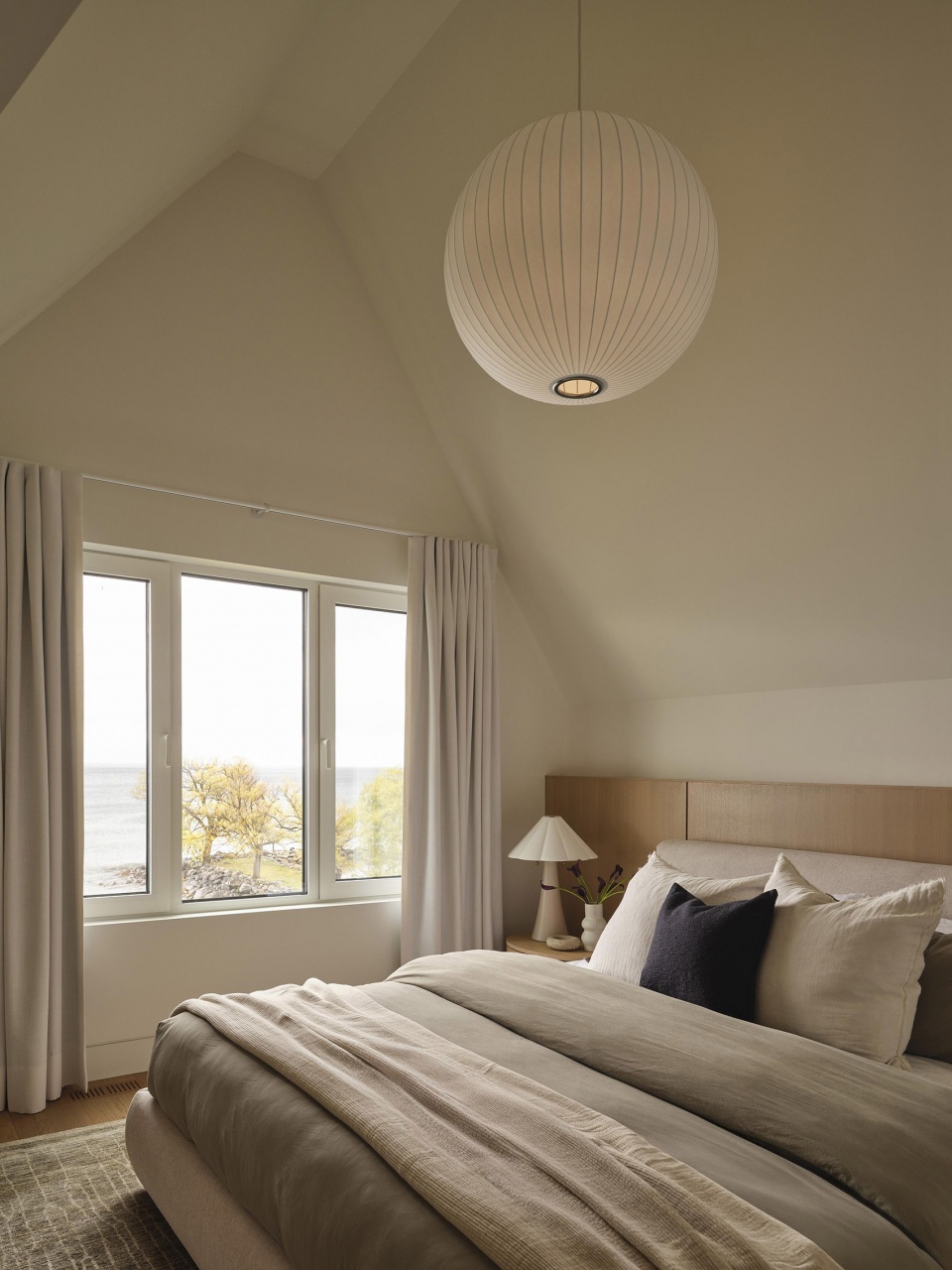 A restrained material palette reinforces this connection. White oak, locally sourced limestone, plaster, and linen establish a foundation of neutral tones layered with warm accents. Muted coastal hues reflect the shoreline’s shifting textures, while natural finishes introduce depth and softness. The result is a home that feels contemporary, yet timeless — calm, tactile, and deeply contextual.