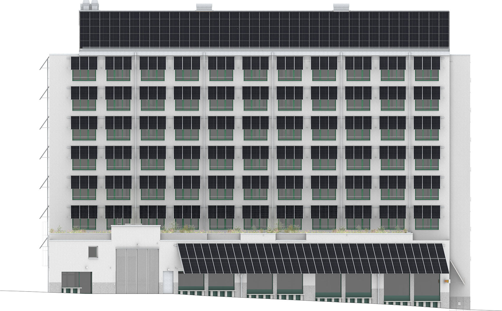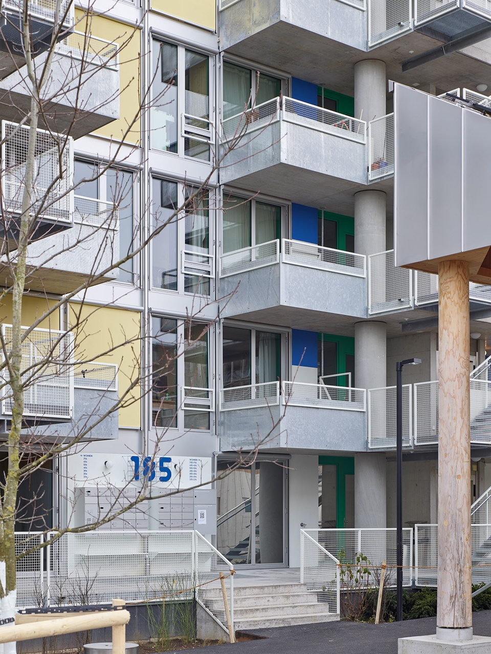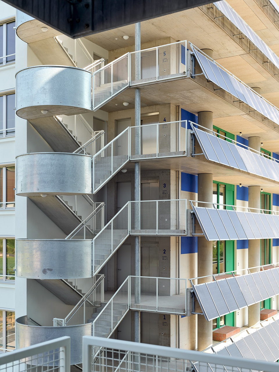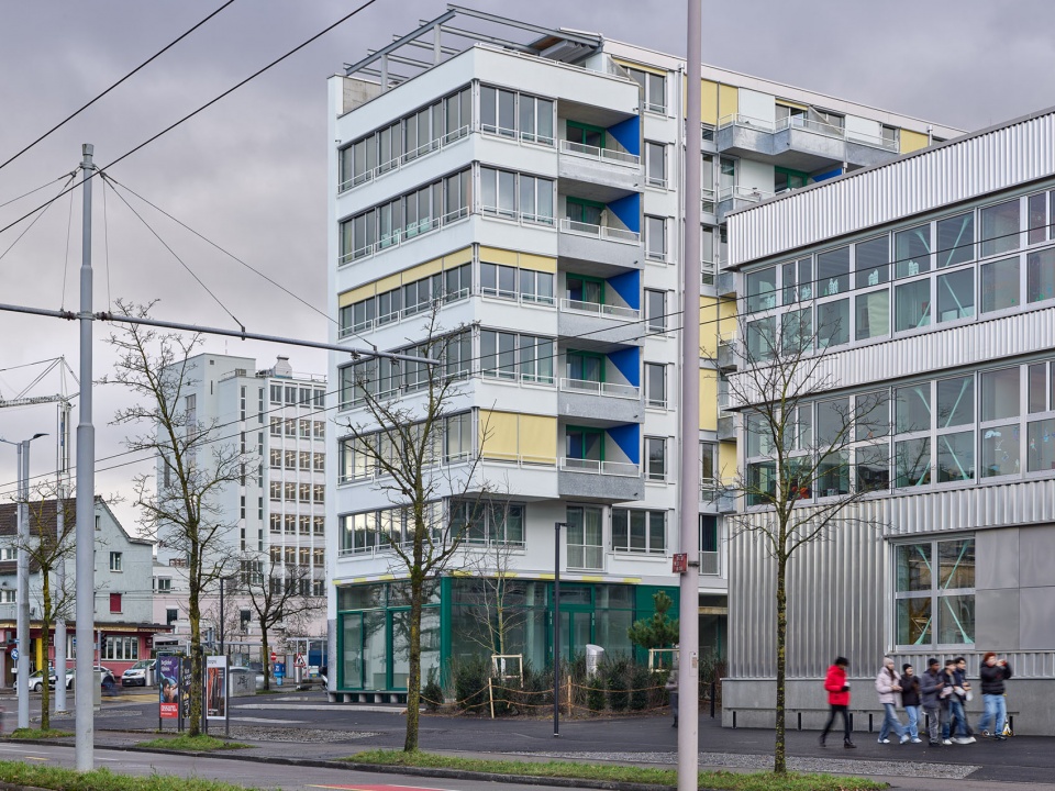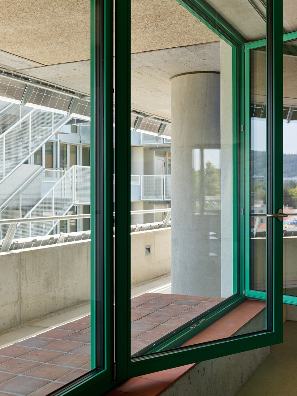 The ensemble’s underlying order is simple, yet its architectural articulation generates complexity through the dialogue with the city. Plinth elements operate as low-threshold transitional spaces, contributing both to the buildings’ expression and to public life. Viewed from Hofwiesenstrasse, the residential buildings form an asymmetrical pair marking the transition between neighbourhoods. Their end façades become “faces” to the city, while park-facing façades define a calm spatial edge. Recurring elements—oversized stone columns, colour accents, articulated circulation—create coherence across the ensemble while allowing each building its own identity. Photovoltaic systems are integrated expressively into façades and roofs, not concealed but made visible as part of the architectural language. PV elements serve simultaneously as energy generators, shading devices, and urban signifiers, contributing to a place-defining façade rarely associated with standardised housing or energy infrastructure. Roof-mounted systems complete the energy concept, supplying a significant share of on-site electricity and making post-fossil energy production perceptible in everyday life.