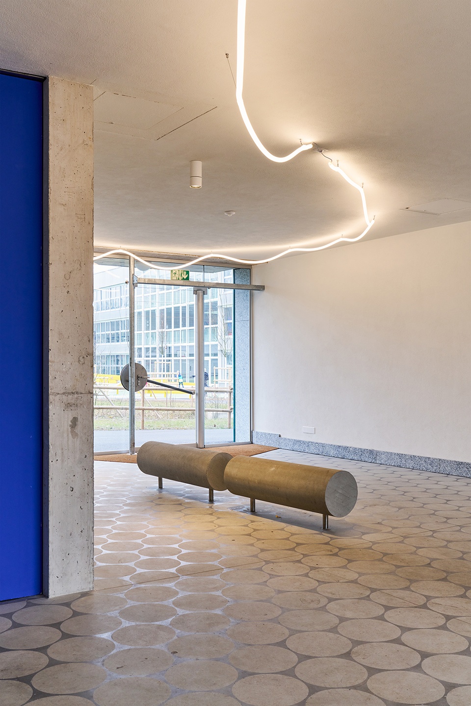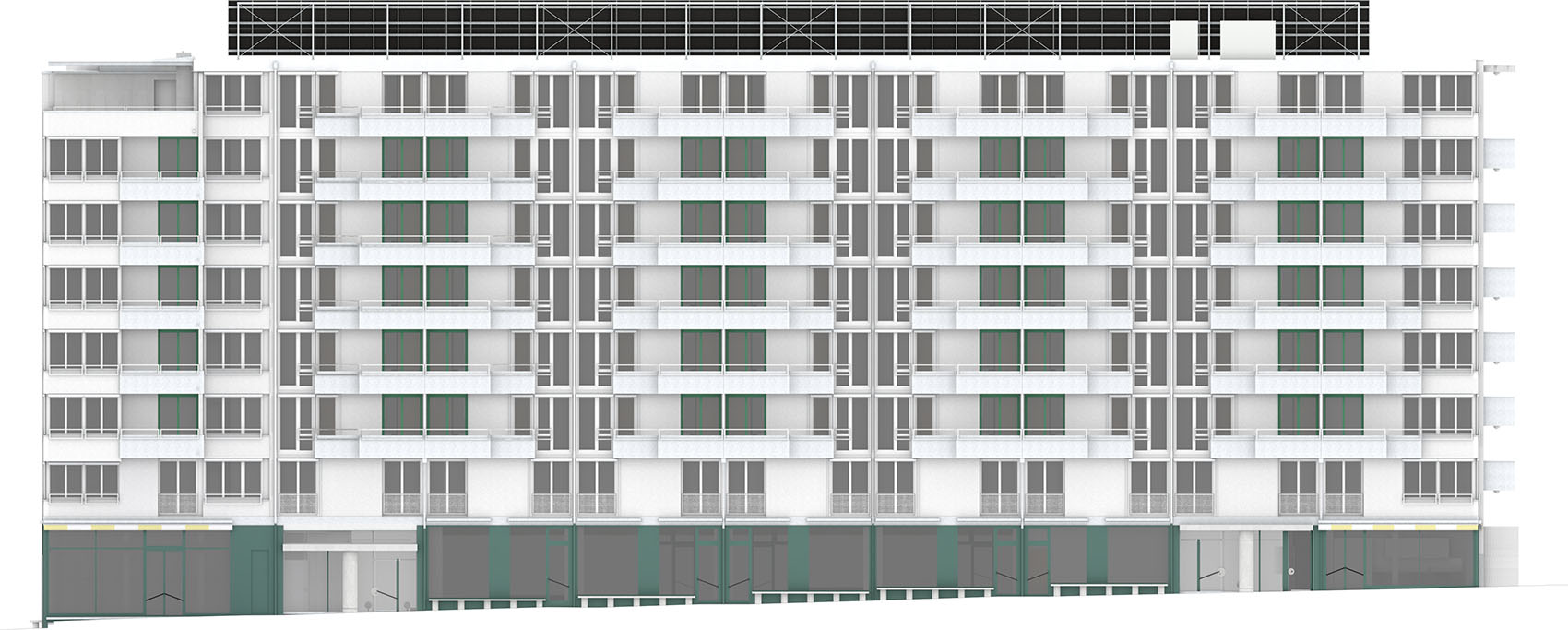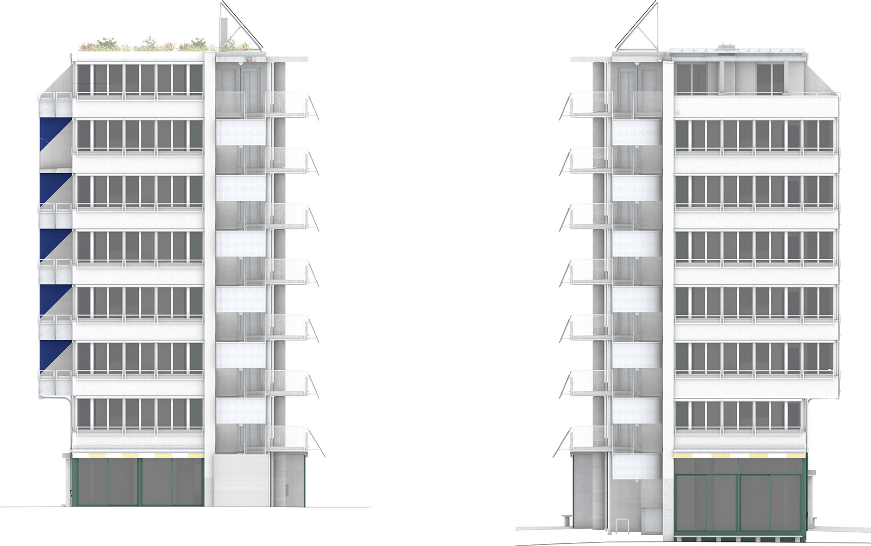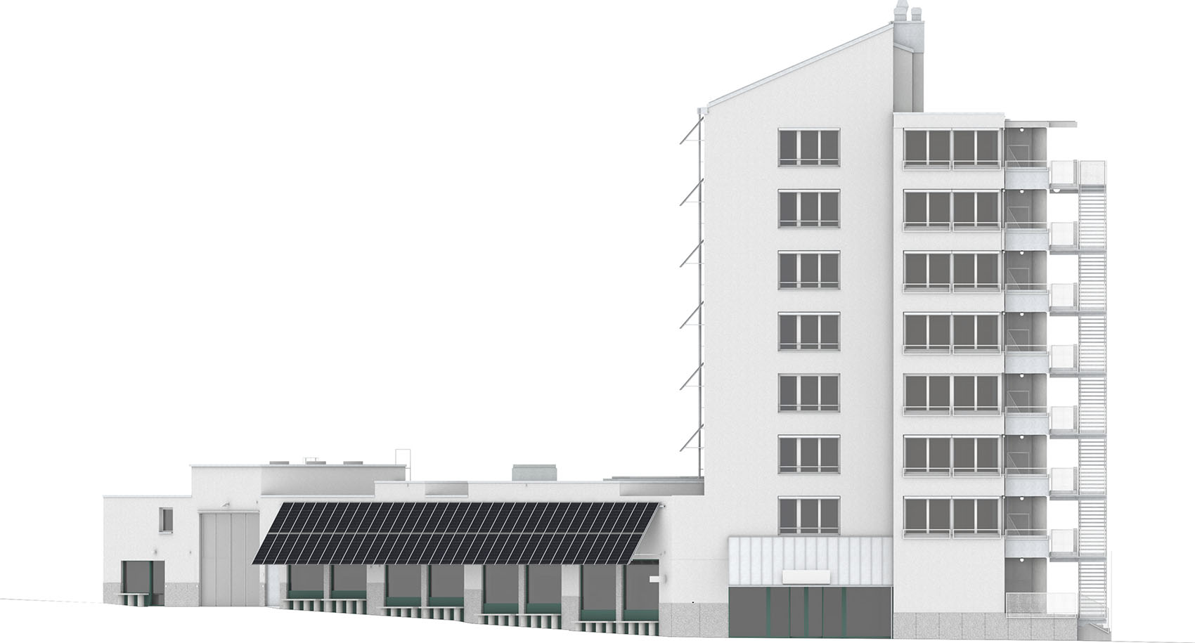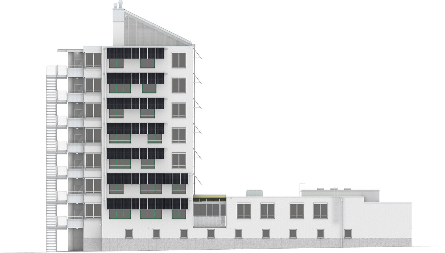 The ensemble’s underlying order is simple, yet its architectural articulation generates complexity through the dialogue with the city. Plinth elements operate as low-threshold transitional spaces, contributing both to the buildings’ expression and to public life. Viewed from Hofwiesenstrasse, the residential buildings form an asymmetrical pair marking the transition between neighbourhoods. Their end façades become “faces” to the city, while park-facing façades define a calm spatial edge. Recurring elements—oversized stone columns, colour accents, articulated circulation—create coherence across the ensemble while allowing each building its own identity. Photovoltaic systems are integrated expressively into façades and roofs, not concealed but made visible as part of the architectural language. PV elements serve simultaneously as energy generators, shading devices, and urban signifiers, contributing to a place-defining façade rarely associated with standardised housing or energy infrastructure. Roof-mounted systems complete the energy concept, supplying a significant share of on-site electricity and making post-fossil energy production perceptible in everyday life.