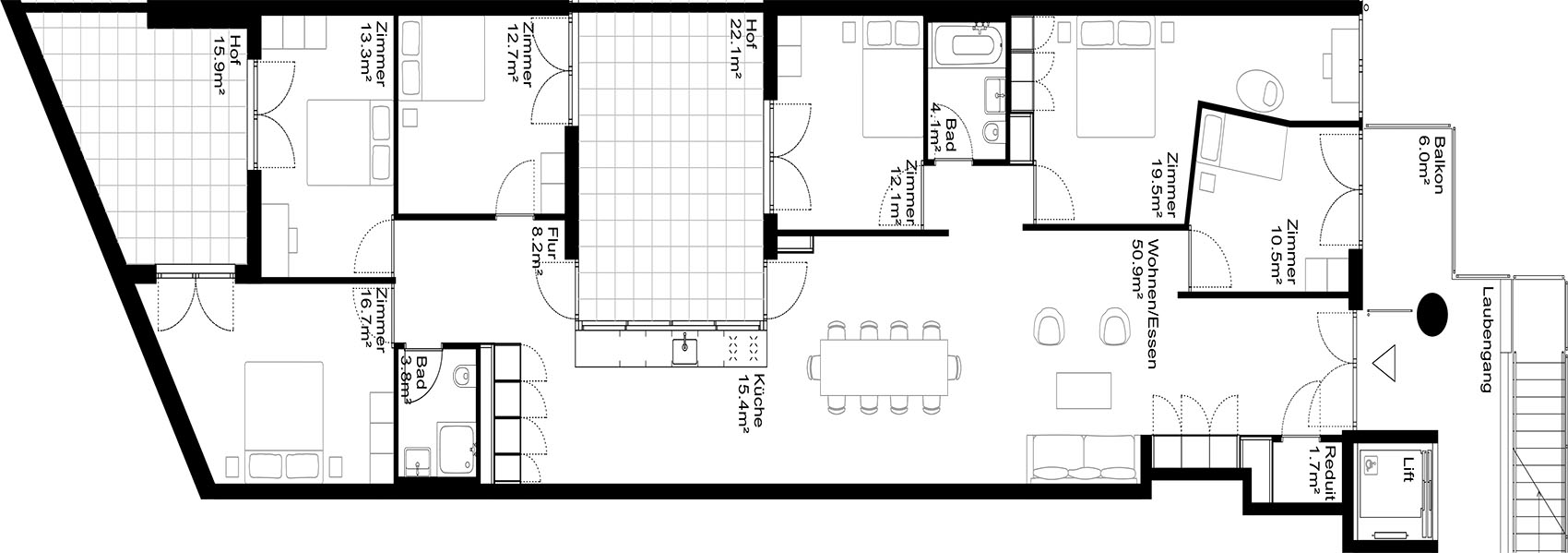 Rational stacking, compact building depths, and a consistent structural system enable efficient construction. Despite modest storey heights and minimum apartment sizes, spatial generosity is achieved via through-apartments, clear organisation, and carefully proportioned façades. The internal organisation of the apartments—with a bedroom extending towards the façade via an anteroom—enables efficient spans. This consistent use of party-wall construction selects a structural typology that can be realised quickly and cost-effectively. And yet, despite this rationality, the apartments achieve considerable spatial richness. Even with relatively modest storey heights and minimum sizes in accordance with housing subsidy requirements, they feel generous. Economical construction elements form a restrained background, complemented by selective accents and appropriation-friendly details. Low investment costs result in a distinctive architectural expression and high everyday usability. A limited degree of collective “luxury”—roof terraces, generous entrance spaces, shared thresholds—benefits many and counters the risk of bleakness. The architecture remains deliberately unfinished enough to absorb traces of life and invite appropriation.