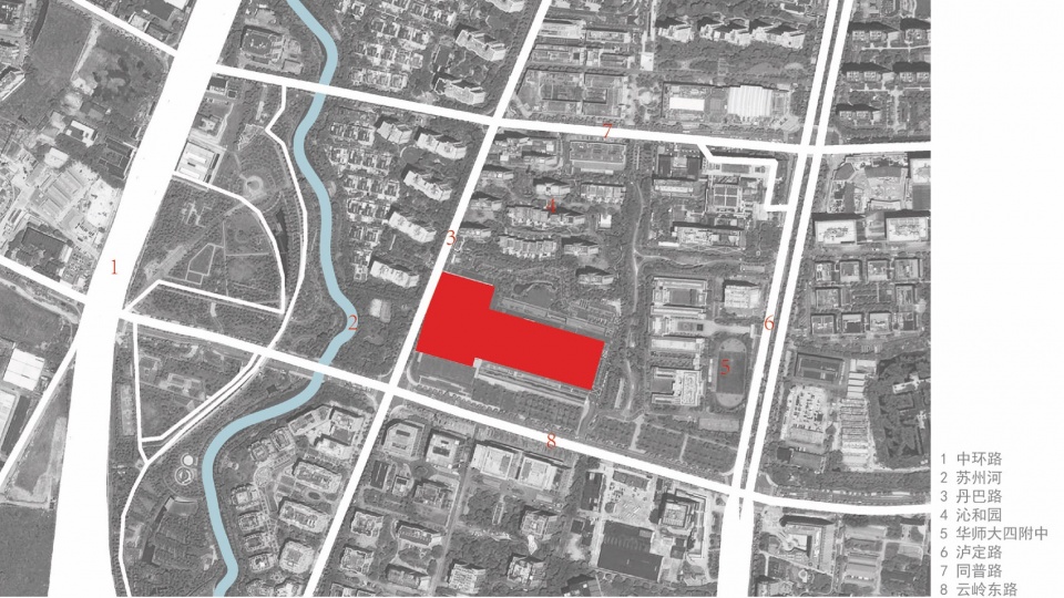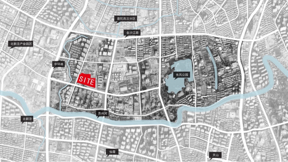 项目基地位于丹巴路以东,云岭东路以北,东邻华师大四附中,北靠庆隆长风住宅项目沁和园,是长风生态商务区的西南门户节点。基地前身是1958年迁址于此的华丰钢铁厂,1965年该厂由上海市冶金局划归上海市机电一局农机公司(上汽集团前身)正式进军汽车行业。1992年华丰厂与上海压铸厂合并成立上海有色铸造总长,2001年上汽集团在华丰厂基础上合资成立上海皮尔博格有色零部件有限公司,并于2010年告别云岭东路厂区搬迁至嘉定,原有厂区经城市更新规划调整确定为商务、商业、文化混合用地。基地周边公共交通便利,教育、科研、文教、医疗及商业设施都较为充足。场地绿化景观资源丰富,北、东、南三面都被30-50米宽的绿带环绕,西侧隔路邻近城市公园。