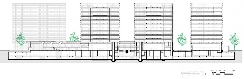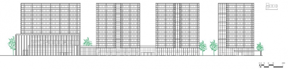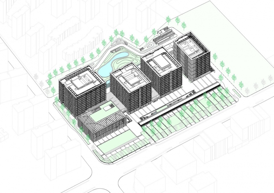 The northern garden also includes various facilities such as open-air meeting spaces, relaxation areas, and sports fields located within the grassy areas and beneath the water cascading structures. These amenities not only serve the internal community of the business park but are also open to the surrounding neighborhoods and the city, fostering interaction between the client and the urban environment.