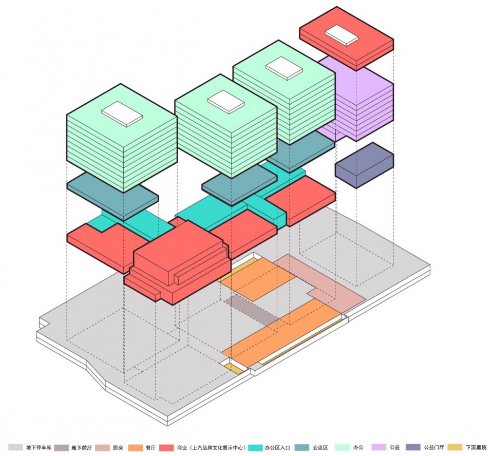为了凸显上汽集团汽车服务业务的示范性、体验性和品牌性,我们在场地西南角临十字路口公众可达性最好的位置布置了一栋4层高方形体量的上汽品牌中心,并以此为关节点沿南侧和西侧道路呈L形布置四栋56米高的塔楼。这样的布局让四栋塔楼尽量远离北侧住宅区,与其之间留出大面积的共享花园空间,在解决日照影响的同时,保障了各自的私密要求与景观视野。品牌中心(A4楼)北侧的A1楼、以及东侧的A2、A3楼这三栋是商务办公主楼,它们通过相互之间的两层通高连接体在底部联成一体。底层除门厅外布置配套会议中心、文创商业,二层布置健身中心、后勤及物业部门。最东侧的B楼相对独立、作为还建地方政府的公益文化设施。建筑群沿云岭东路自西向东260米一气呵成展开,衬着50 米宽的城市绿带,向城市展示了一个兼具公共性和地标性的汽车文化界面。