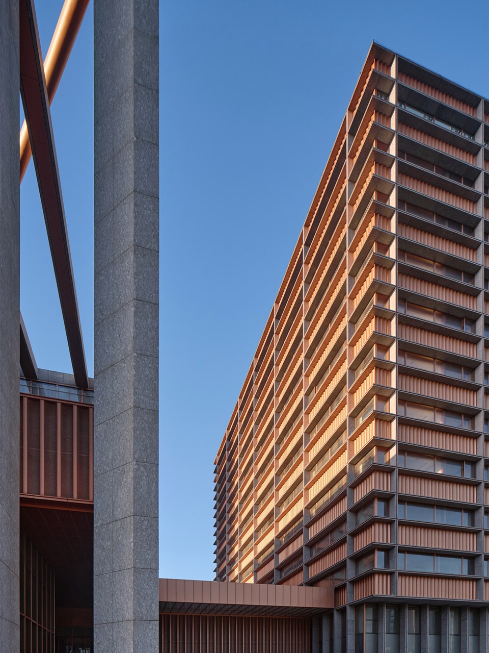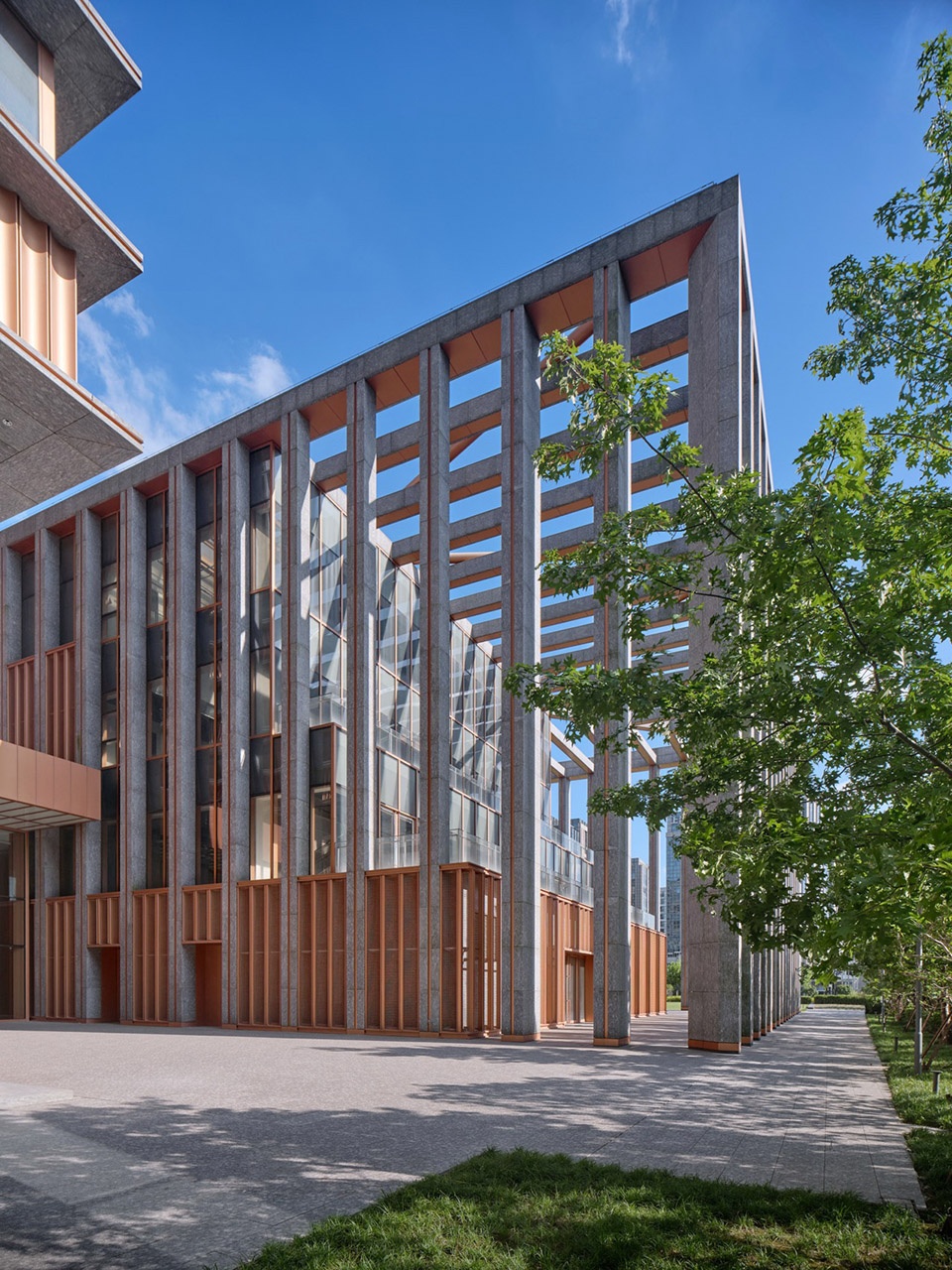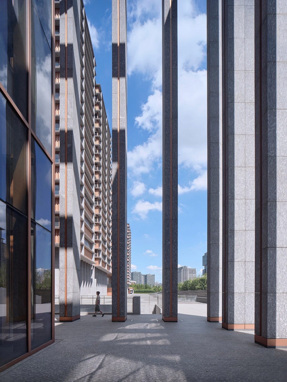 The Brand Center has the most distinctive façade treatment in the project. A colonnade of densely spaced stone columns spans its south and west sides, forming an open urban interface that adjusts the building’s scale relative to the rest of the project while emphasizing its role as a spatial joint node. Inside the colonnade, stacked and interlocking box volumes create a variety of terraces and cantilevered spaces. These boxes consist of two types: semi translucent double-layer curtain walls clad in curved copper-colored perforated aluminum panels, and transparent single-layer glass curtain walls, accommodating two vertically offset double-height interior spaces.