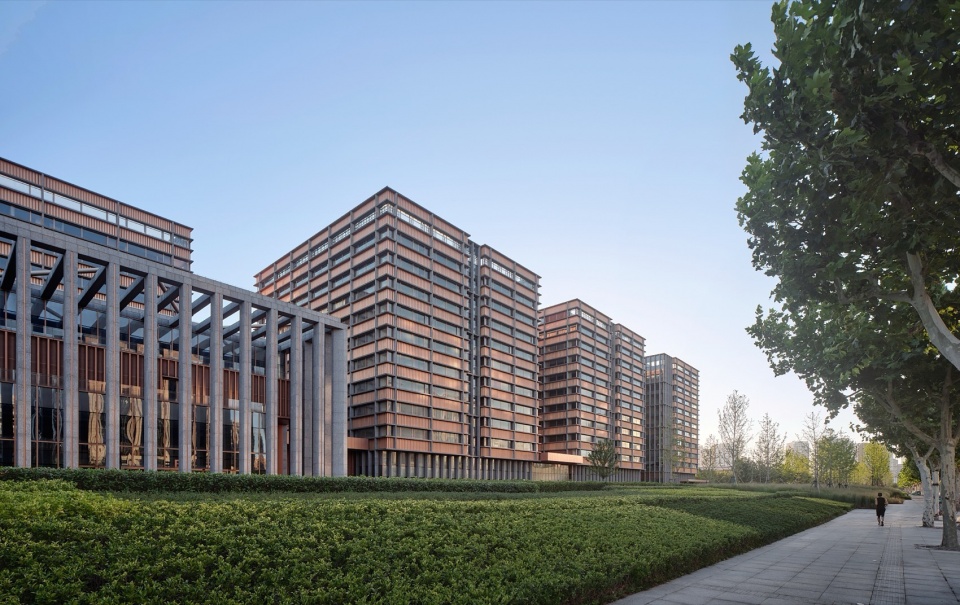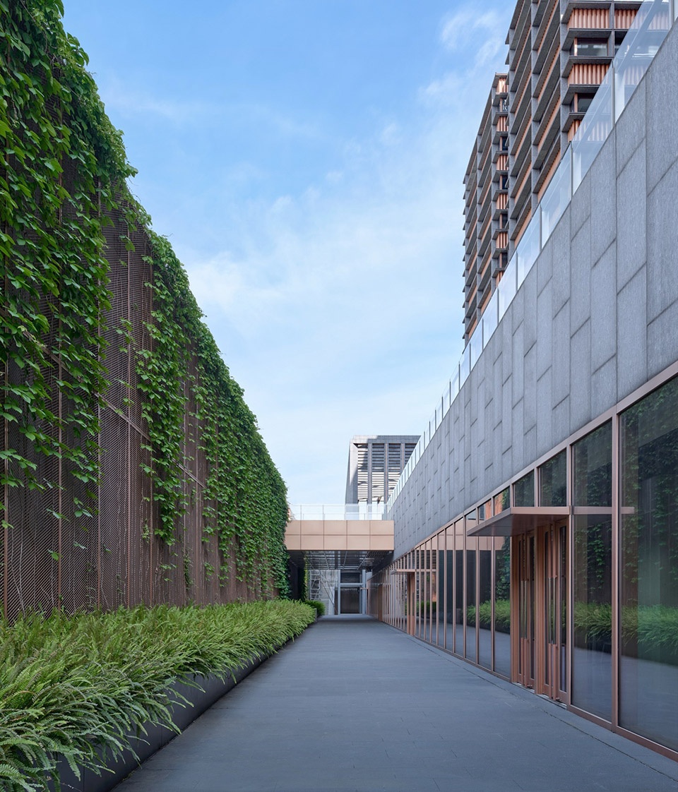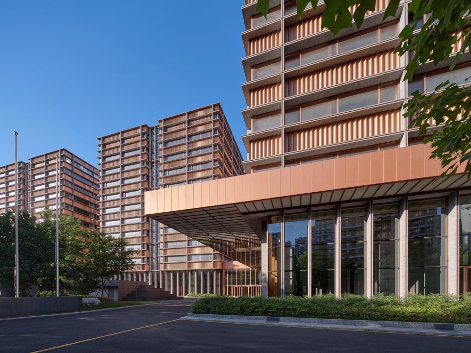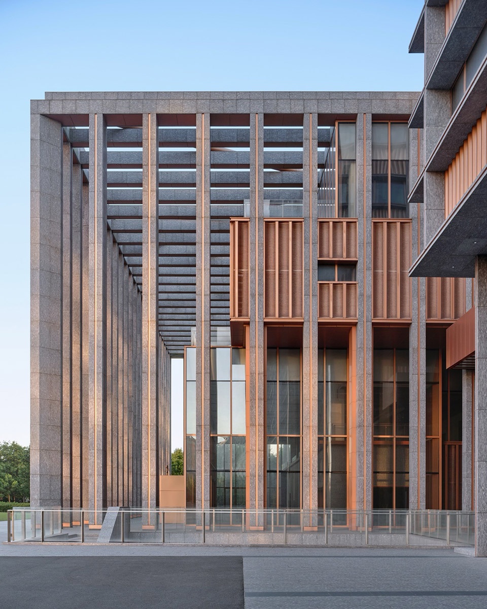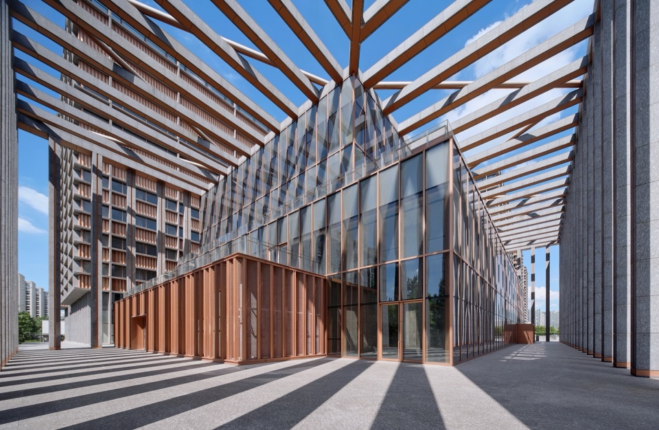 The Brand Center has the most distinctive façade treatment in the project. A colonnade of densely spaced stone columns spans its south and west sides, forming an open urban interface that adjusts the building’s scale relative to the rest of the project while emphasizing its role as a spatial joint node. Inside the colonnade, stacked and interlocking box volumes create a variety of terraces and cantilevered spaces. These boxes consist of two types: semi translucent double-layer curtain walls clad in curved copper-colored perforated aluminum panels, and transparent single-layer glass curtain walls, accommodating two vertically offset double-height interior spaces.