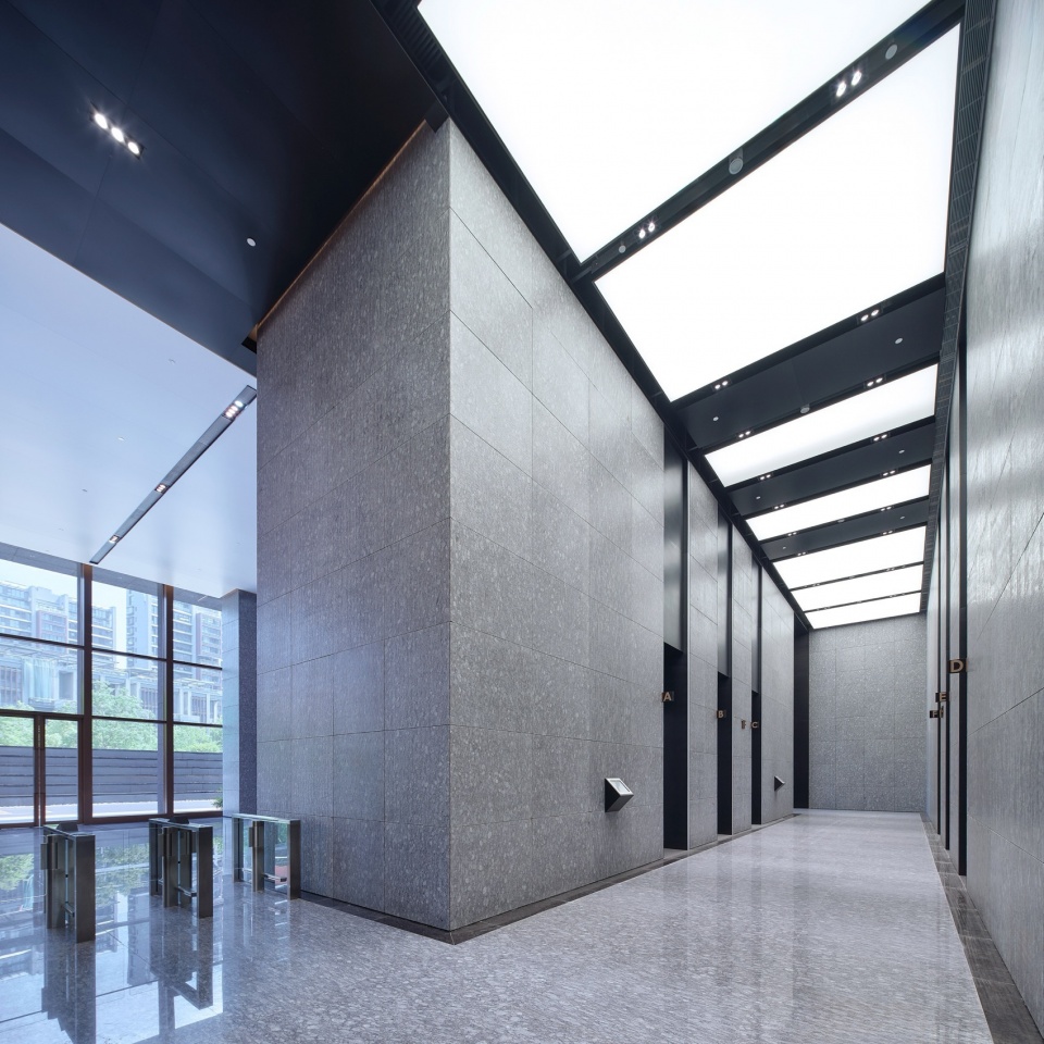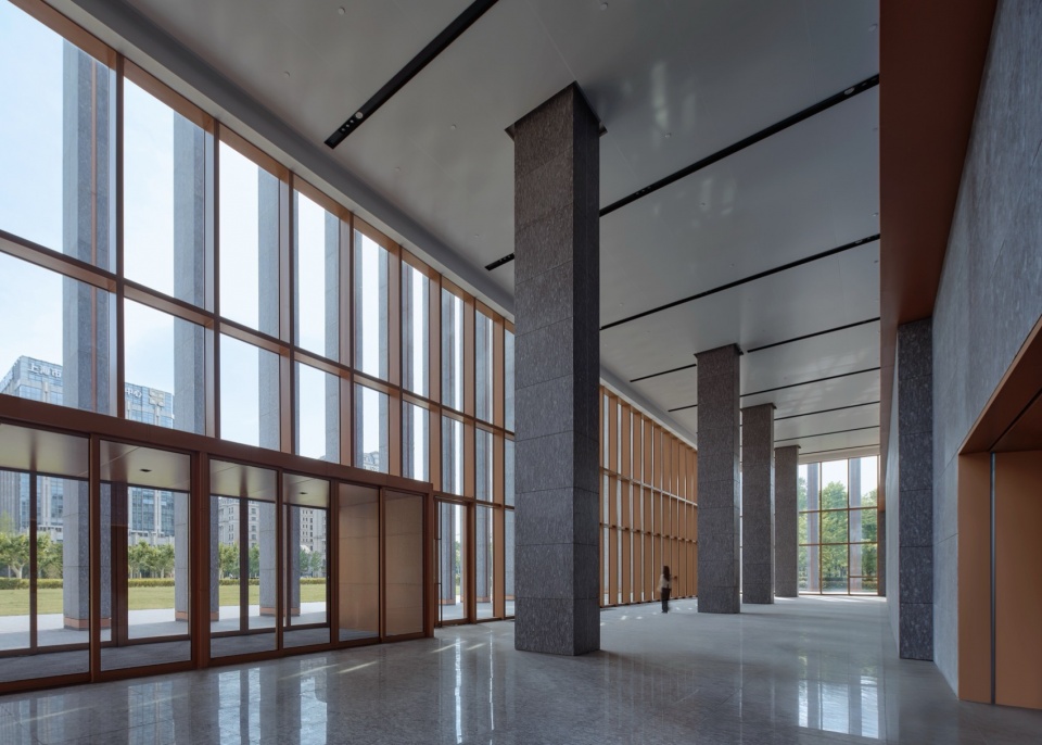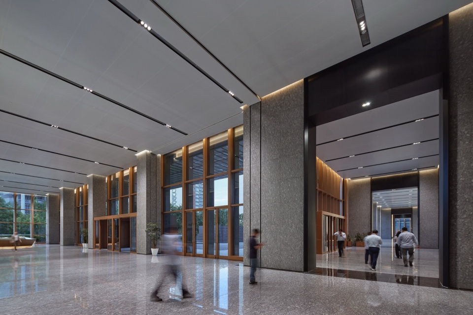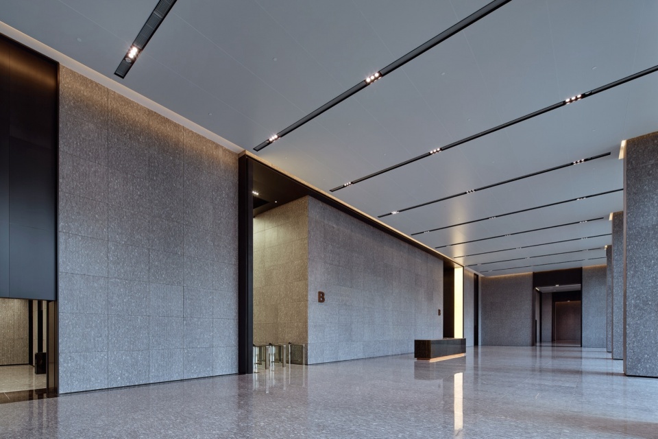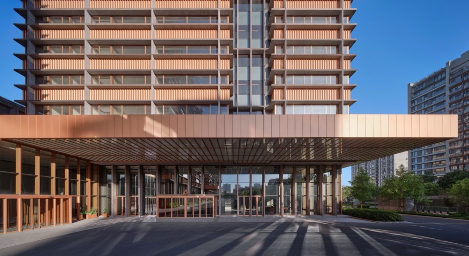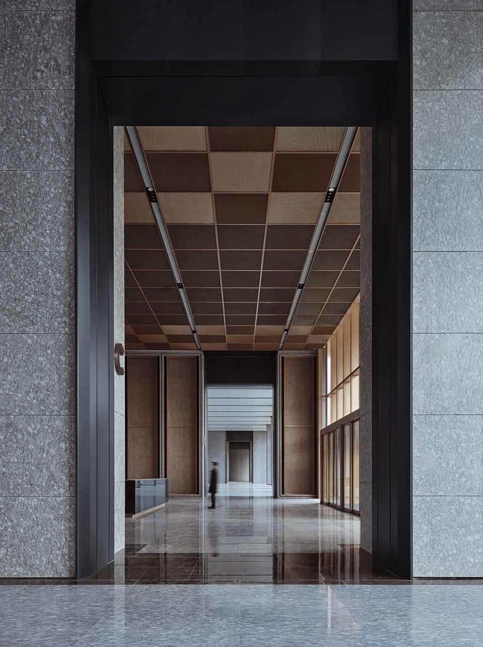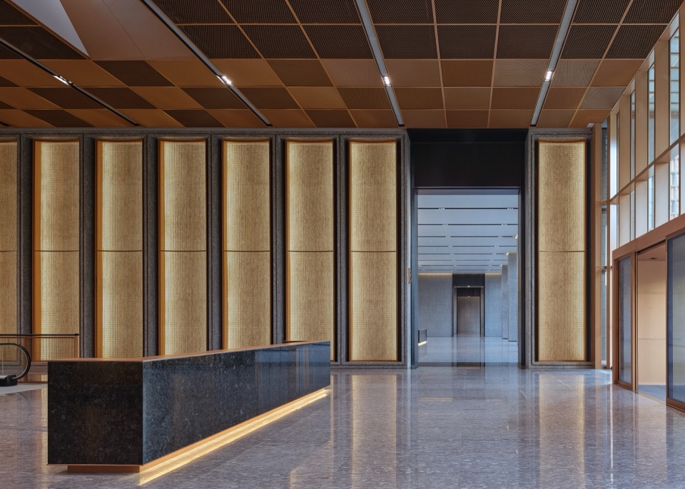 The window strips use high-strength original Schüco systems, with each fixed glass panel measuring up to 6m2, providing an unobstructed panoramic city view. The spandrel sections are made from recessed, curved aluminum profiles with a copper metallic finish, evoking the beauty of automotive craftsmanship under varying light conditions. The vertical grooves of towers continue down to the first two levels, where they are clad in glass curtain walls with two-story-high stone vertical lattice, giving a lighter and more transparent appearance than the slab volumes. The detailing of this lattice is consistent with the horizontal lattice of slab volumes. A large copper-colored aluminum canopy with an luminous ceiling extends above the drop-off entrance of Tower A1. The two connecting structures between the main office towers and the brand center feature floor-to-ceiling glass curtain walls with canopies of copper-colored aluminum, creating the most transparent areas of the project. Building B, serving as a cultural facility, has the smallest standard floor size and an asymmetric core arrangement, resulting in an interlocking effect between the vertical glass curtain wall on the west side and the slightly protruding slab volume with horizontal lattice of windows and aluminum spandrels on the east.