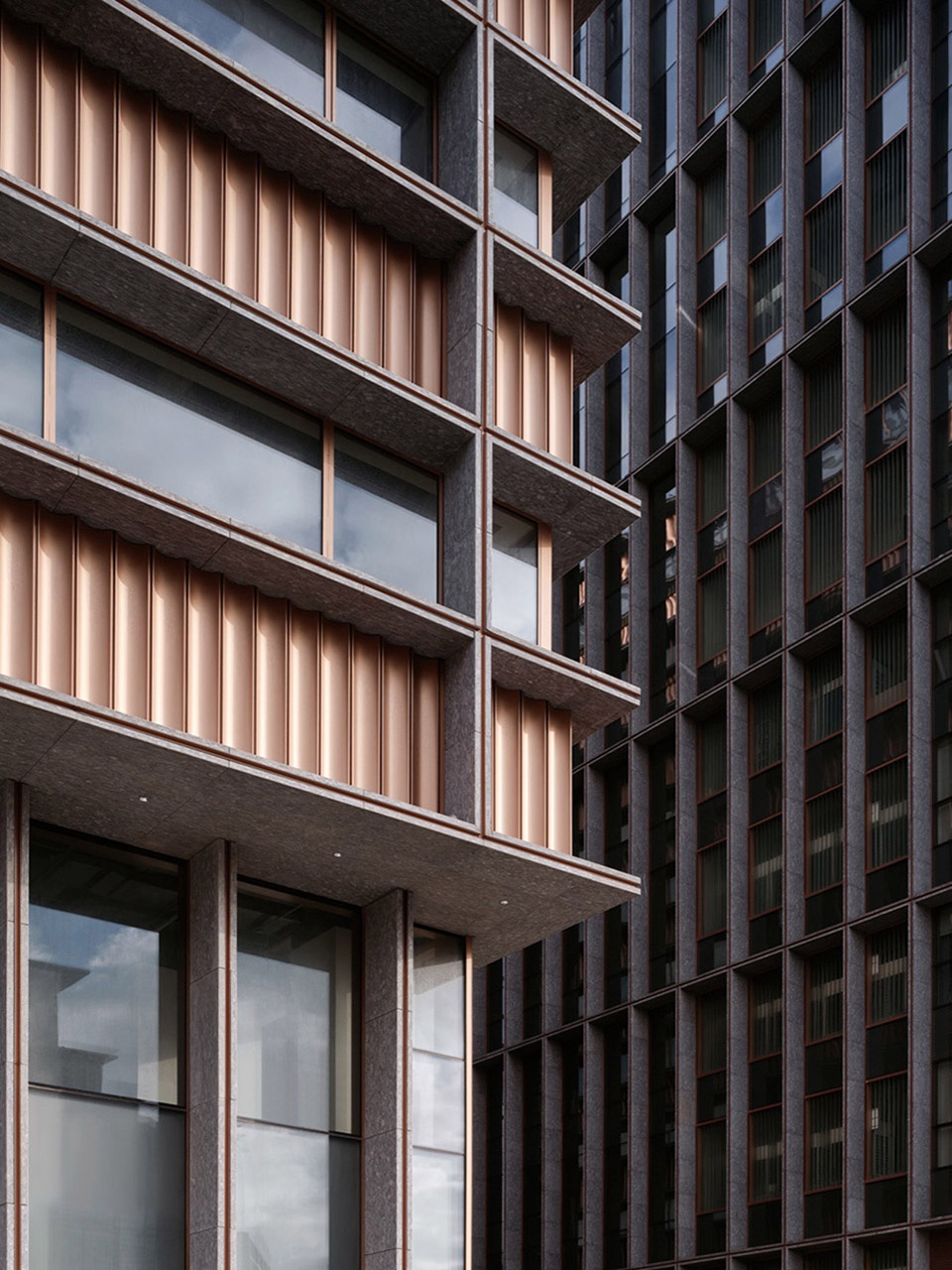 窗带采用高强度的原产旭格窗系统,单块固定扇达到6平米,形成室内无遮拦的超宽横屏城市景观视野。窗间墙带部分采用了仿铜金属漆质感的内凹弧形铝型材拼接,在光影变化下展现出汽车工艺般的美感。塔楼竖向凹槽延续到塔楼首二层立面是带有两层高竖向石材格构的玻璃幕墙,比板状体量更轻盈通透,格构做法与板状体量的横向格构相同。A1楼车行入口上方设有大尺度出挑的铜色铝板宽大雨棚,底面配有发光顶棚。三栋主楼及品牌中心之间的两处连接体由带有铜色铝板挑檐雨棚的通高全玻幕墙维护,形成整个项目中最通透的部分。作为文化配套的B楼标准层相对最小,形体处理呼应内部偏心核心筒布置,形成西侧的竖向格构玻璃幕墙体量与东侧微凸的横向格构窗带-铝板带体量互相咬合的效果。