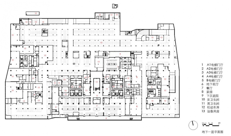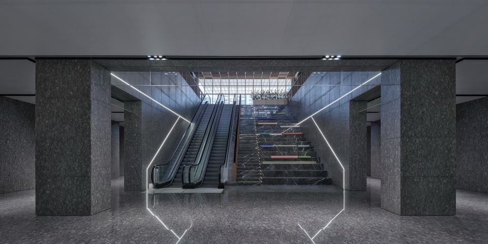 The four towers are designed with dual entrances on both the inner and outer sides of the site. The inner entrances face the garden and connect to the internal driveway for vehicular drop-off, while the outer entrances face the street for pedestrian access. The A1 tower features an independent, dedicated vehicular entrance facing east. Towers A2 and A3 share a north-facing vehicular entrance. Inside, this entrance leads to a two-story-high public lobby that connects the three towers over a total length of 195m. The lobby is divided into five sections: three sections serve as the foyer outside the elevator lobbies of each tower, and the remaining two sections provide connecting spaces between the towers. The linking structure between A1 and A2 extends westward and southward, connecting to the A4 Brand Center. The westward extension forms the pedestrian entrance facing Danba Road, while the southward extension houses a 400-seat conference hall between A2 and A4. The link between A2 and A3 extends south to the pedestrian entrance facing Yunling East Road, forming a spacious north-south hall with a series of high northern clerestory and an escalator leading to the basement-level staff cafeteria.