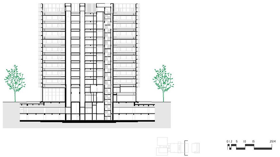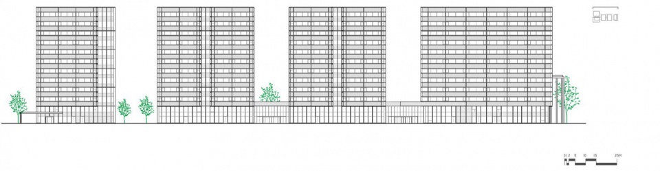 立面设计回应上汽集团的品牌定位及汽车工业的美学特质,塑造项目整体简约理性、雅致精密、又富于视觉冲击力的气质。三栋办公主楼的南北主立面上设置竖向凹槽将单栋塔楼调适为两片板状体量微挑于首二层以上、与凹槽相夹的三明治状态,使塔楼在保证楼层使用进深的前提下在视觉上显得相对更为修长,并用两种幕墙类型来分别定义板状体量和凹槽这两部分的外立面。对于作为代表项目形象识别度的板状体量部分,我们采用了带有半层高横向外突石材遮阳格构的水平长窗带和铝质窗间墙带竖向虚实交替的系统,形成富于韵律感的光影效果。石材格构的外缘端部居中嵌入铜色铝材凹槽,让格构更显精致细腻。