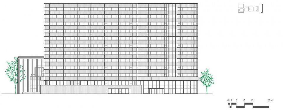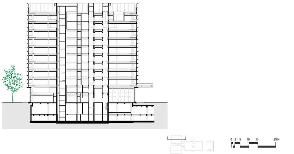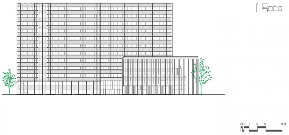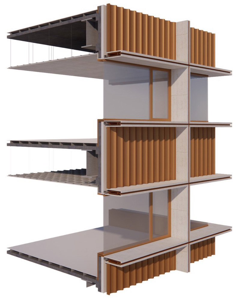 Primary Building Materials: Indian Blue Granite, Copper Colored Fluorocarbon Spray Pre-coated Aluminum Sheeting, Perforated Plate and Profile, Ultra Clear Glass, Schüco Window System, Brushed Stainless Steel