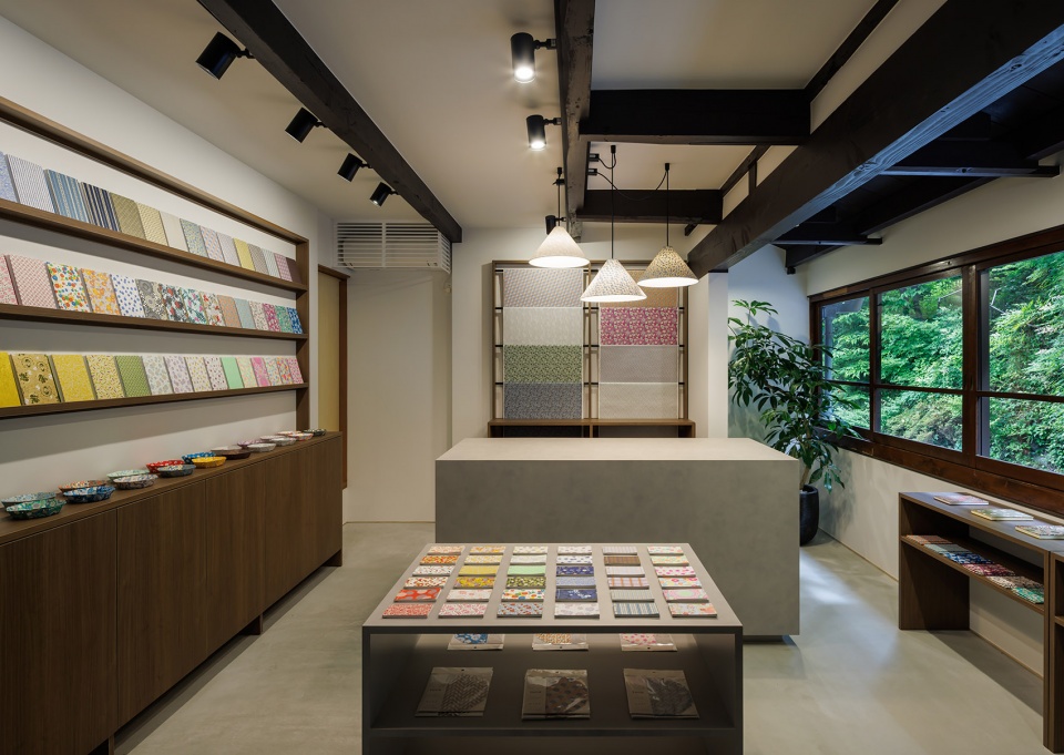 一个长柜台可以平铺整张友禅和纸,其后的挂架则完整展示着图案醒目的作品。
