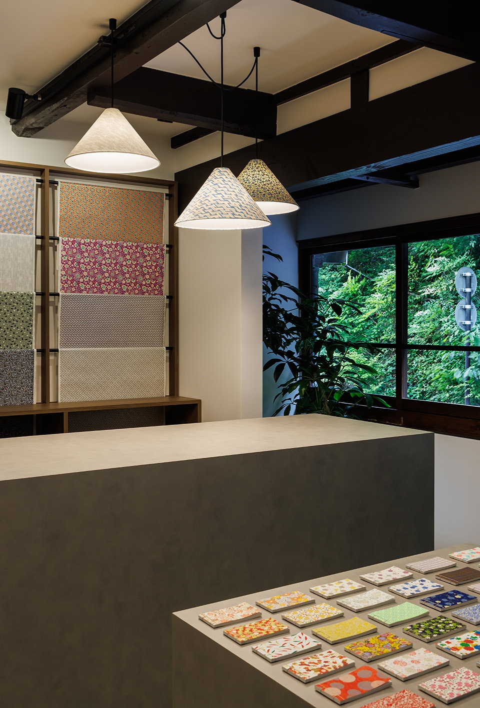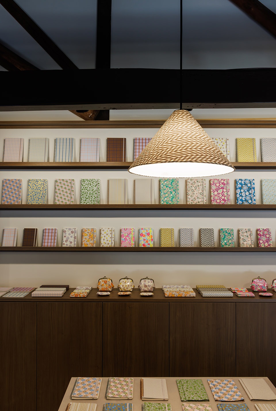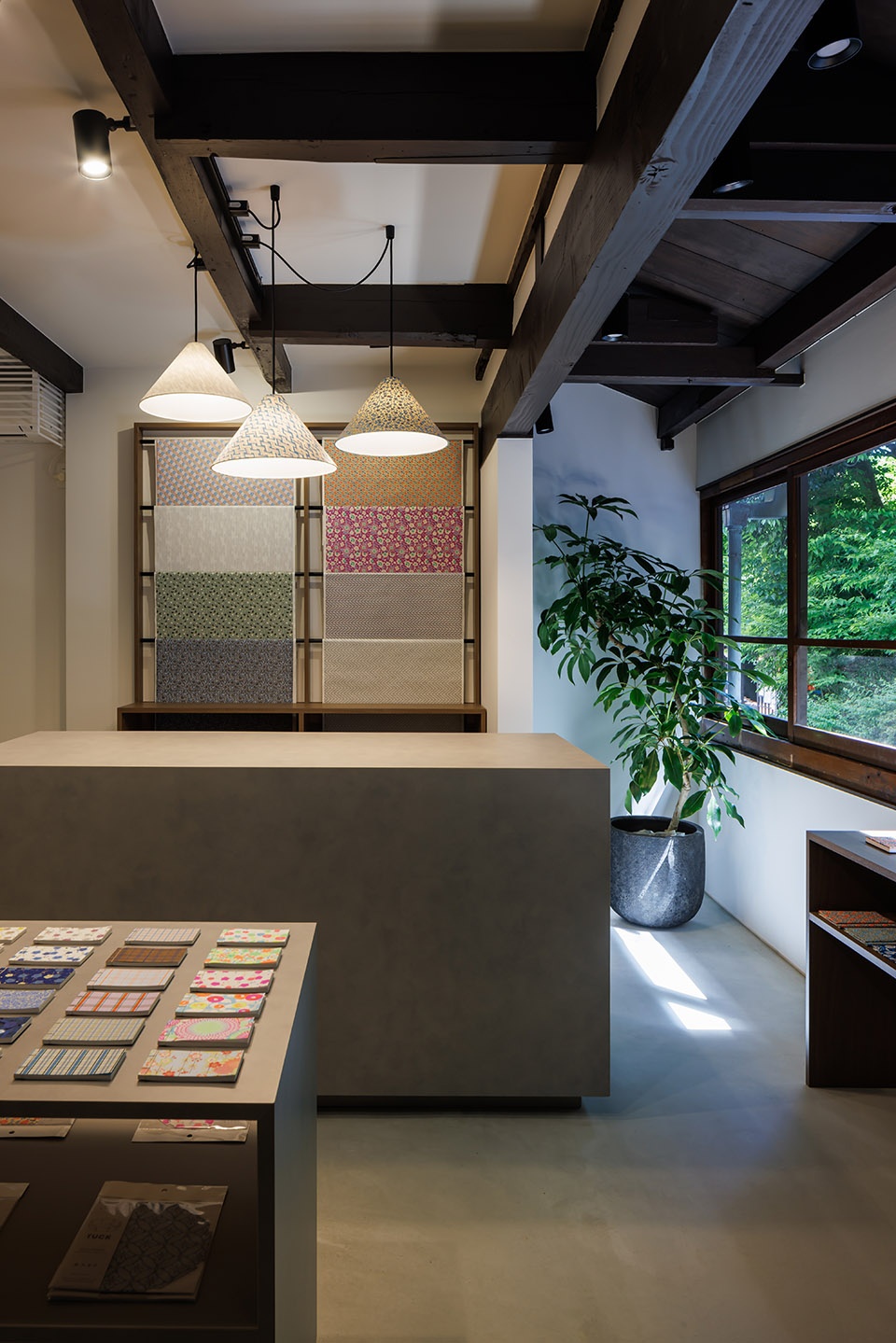 Lighting was carefully planned to support both the atmosphere and the presentation of the products. Spotlights fixed to the beams are angled to softly illuminate the space without creating glare. Pendant lamps made from Yuzen washi paper glow as beautiful features, both familiar and unexpected.