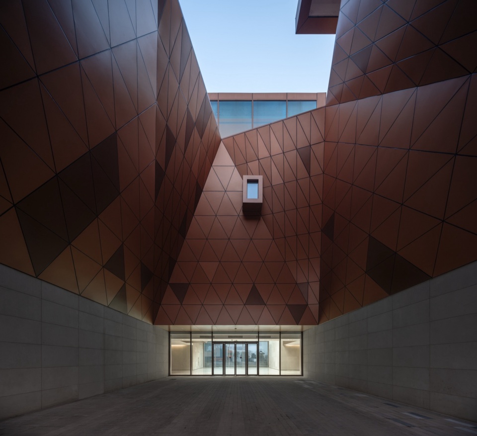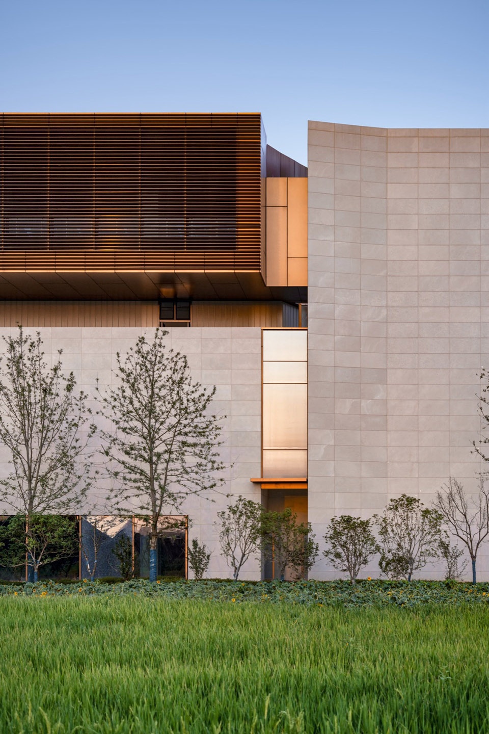 几个展厅被设计成不同开放密度的容器,立面与屋顶开口的设计,不同季节与气候条件下的光影和田园通过丰富变化的方式引入内部空间,行进中的漫步流线与农田间劳作的农民产生有趣的对话。三角形铝板幕墙采用几何拼接的方式,营造出富有变化和层次感的图案效果,从而将产业文化转化为一种可见性的表达。令人反思自然与农业之于现代社会的重要性,感知生命与人造自然之间交互的力量。