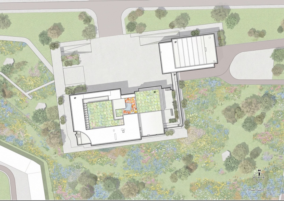 曲折的游线将外部田园游径的蜿蜒轨迹转化为建筑的交通区域,贯穿了展示中心的所有展厅并通向屋顶。