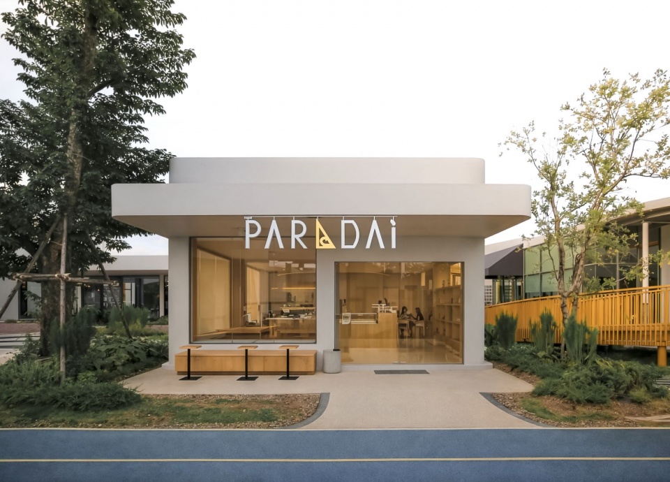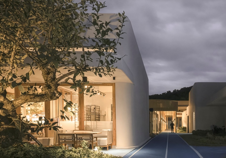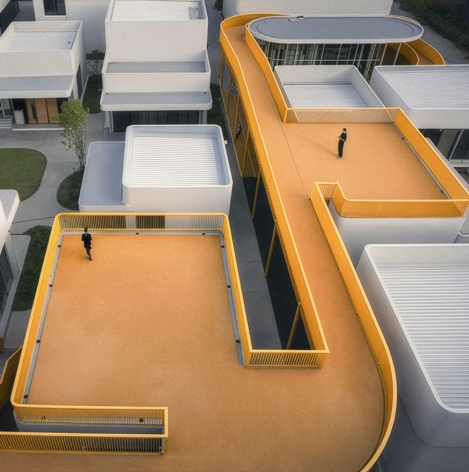 一座架空步道作为项目的动脉,蜿蜒穿行于白色建筑之间,连接起各个零售区域与流线。屋顶通常是商业建筑中被忽视的空间——而在 My Front Yard,屋顶被重新构想为步道、平台和活动空间。这座黄色的步道与中性的白色建筑结构及周围的绿色景观形成了高对比度的对话。它同时提供了第二层的参与界面,让访客能够从多个视角体验这个社区”邻里”,同时为其下方的步道和巷道提供遮荫。