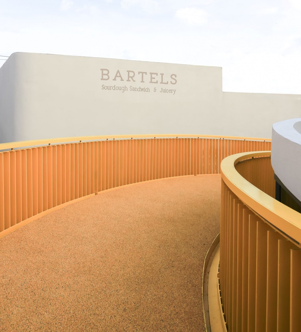 The retail units are designed as clean, white volumes with rounded corners and shaded storefronts. This softened geometry creates a sense of movement and prevents the architecture from feeling imposing. Expansive white walls function as a clean backdrop for bold graphic signage, allowing individual brand identities to be expressed without cluttering the site.