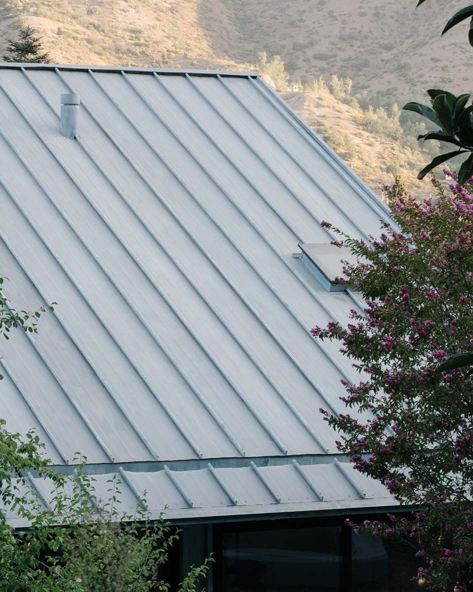 住宅位于安第斯山麓、圣地亚哥郊外。建筑抬起朝向街道的正立面,呈现出一种具有城市性的姿态,同时将背面转向群山。屋顶顺应前方的坡度向下倾斜,几乎延伸至地面,使后立面缩减为一条半埋入地面的细长界面,与花园形成紧密联系。