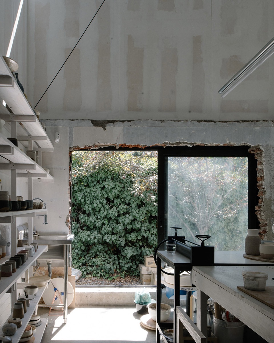 In front of the main façade, the only entirely new addition emerges: the kiln room. Clad in wood and painted white, it stands as the signature of this most recent reinvention—a plastic and programmatic trace of the latest rewriting of this home.