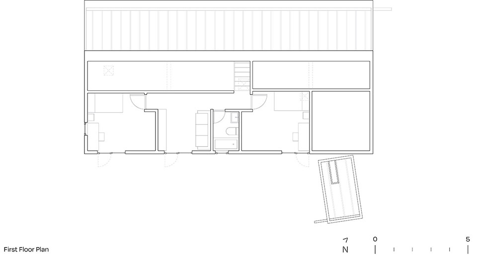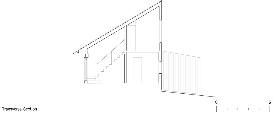 住宅内部仍然保留着不同历史层次之间的对比:材料在各处表面发生变化,仅通过一层白色涂料加以统一。开口被切入内外墙体之中,显露出墙体原有的结构痕迹,坦率地呈现出改造的过程。与之相对,建筑外部整体包覆以立缝金属板,使体量呈现出一种单一材料、整体化的形象。室内展示时间叠加的痕迹,而外部则读作一个完整的整体。