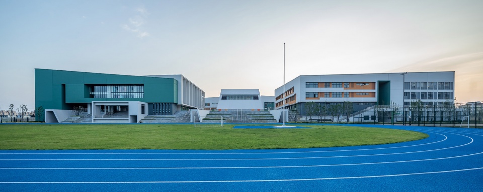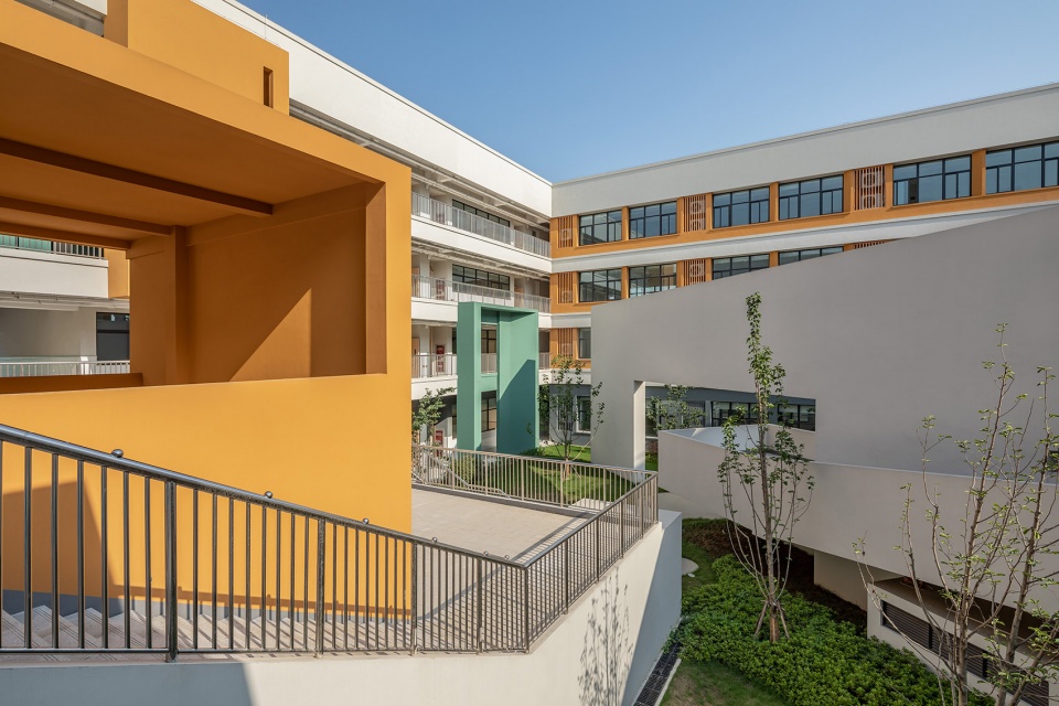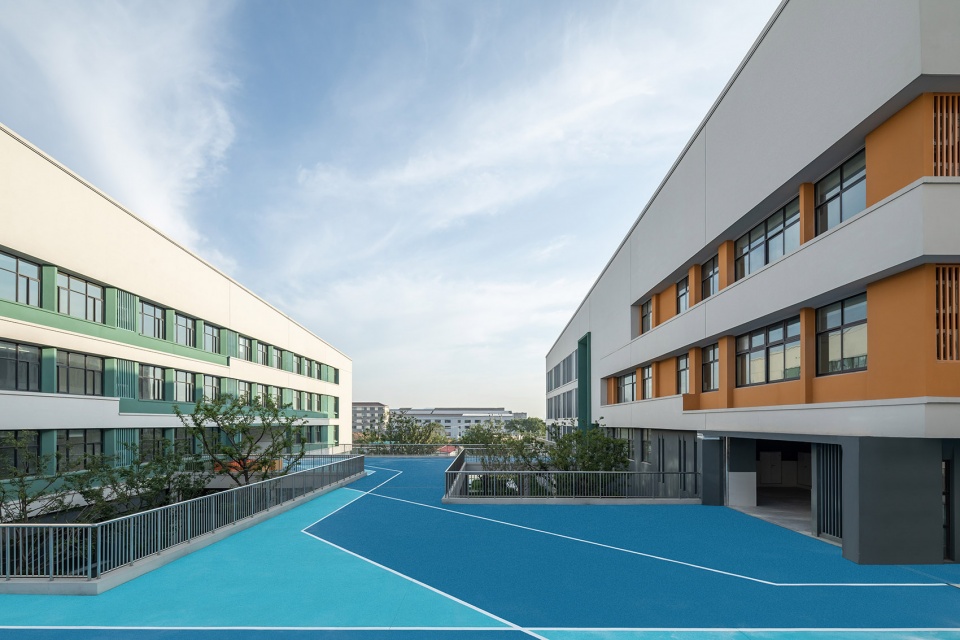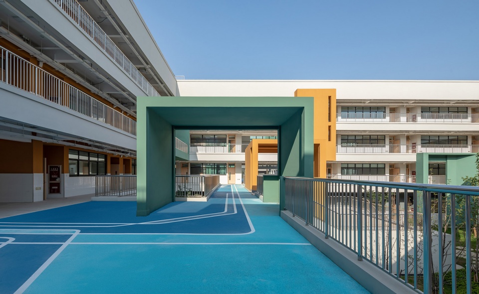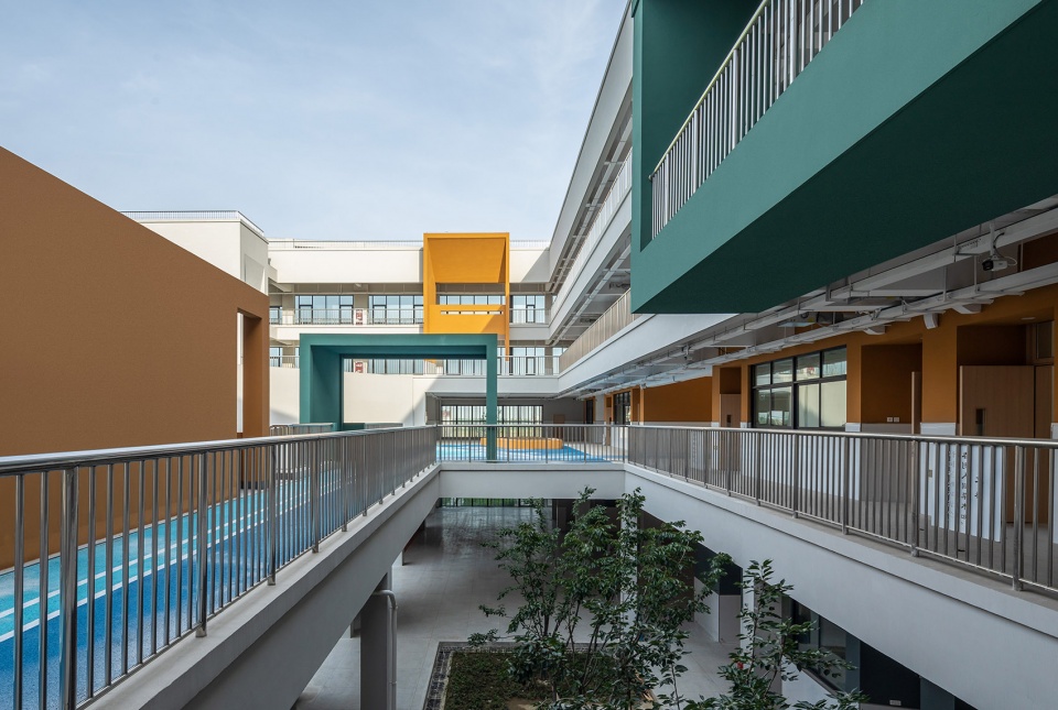 在环形街区的漫游体验中,使用者也可感知到不同色彩标识的功能组团。校园立面整体以墨绿、橙、白与深灰四种颜色构成视觉体系,外立面以白色框架统一基调,通过内饰墙的差异化色彩强化各组团的识别性,在统一中营造差异。低年级组团以橙色凸显活力,高年级组团以墨绿传递沉稳,行政生活组团以白色象征秩序,艺体组团则以墨绿与白色结合呼应开放与动感。