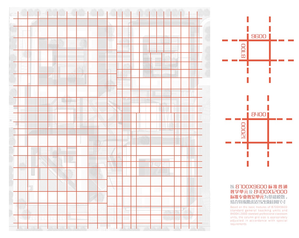 为平衡成本与效率,采用垂直正交体系,以8700 X 9600的标准教学单元柱网作为基础,同时结合一些特殊需求的教学空间适当改变柱网尺寸,打造整体统一又有一定丰富度的模块化组团。立面设计中以横向线条为主,局部通过嵌入模块化体量打破单调,实现弹性与高效的统一。