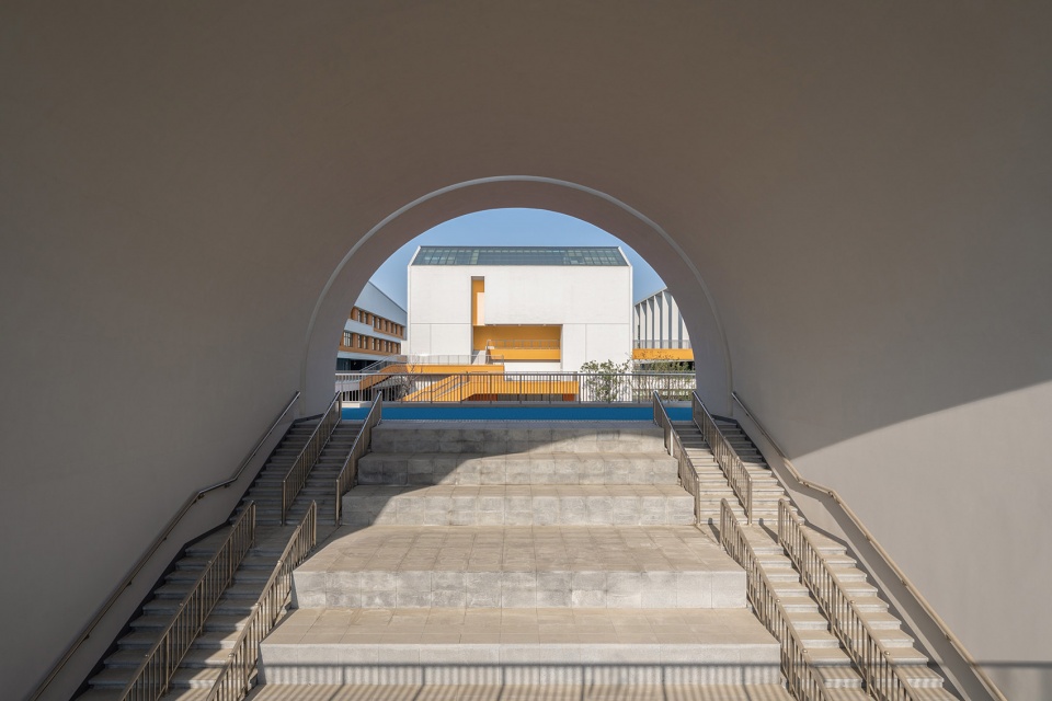 “十字街道”作为校园整体空间结构的核心骨架与活力中枢,通过南北与东西两条开放轴线的立体交织,构建了一个多层次、全天候的公共交互网络。东西向轴线作为校园的形象主轴,自西侧主入口起,依次串联起入口广场、拱形阶梯、校园剧场等高公共性节点,形成具有序列感与仪式性的空间节奏,强化了校园门户形象与文化展示功能;南北向轴线则作为生活与学习交流轴,通过大台阶、架空连廊、共享平台等过渡性空间,有机衔接教学组团、生活服务区与运动场地,引导并承载师生日常通勤、课间交往与自发活动。两条轴线在校园几何中心交汇,围合形成尺度适宜、界面丰富的核心庭院,这一空间不仅成为视觉焦点,更通过柔性的边界、多向的接入与复合的功能设置,持续激发非正式学习、跨年级交往与公共生活事件。