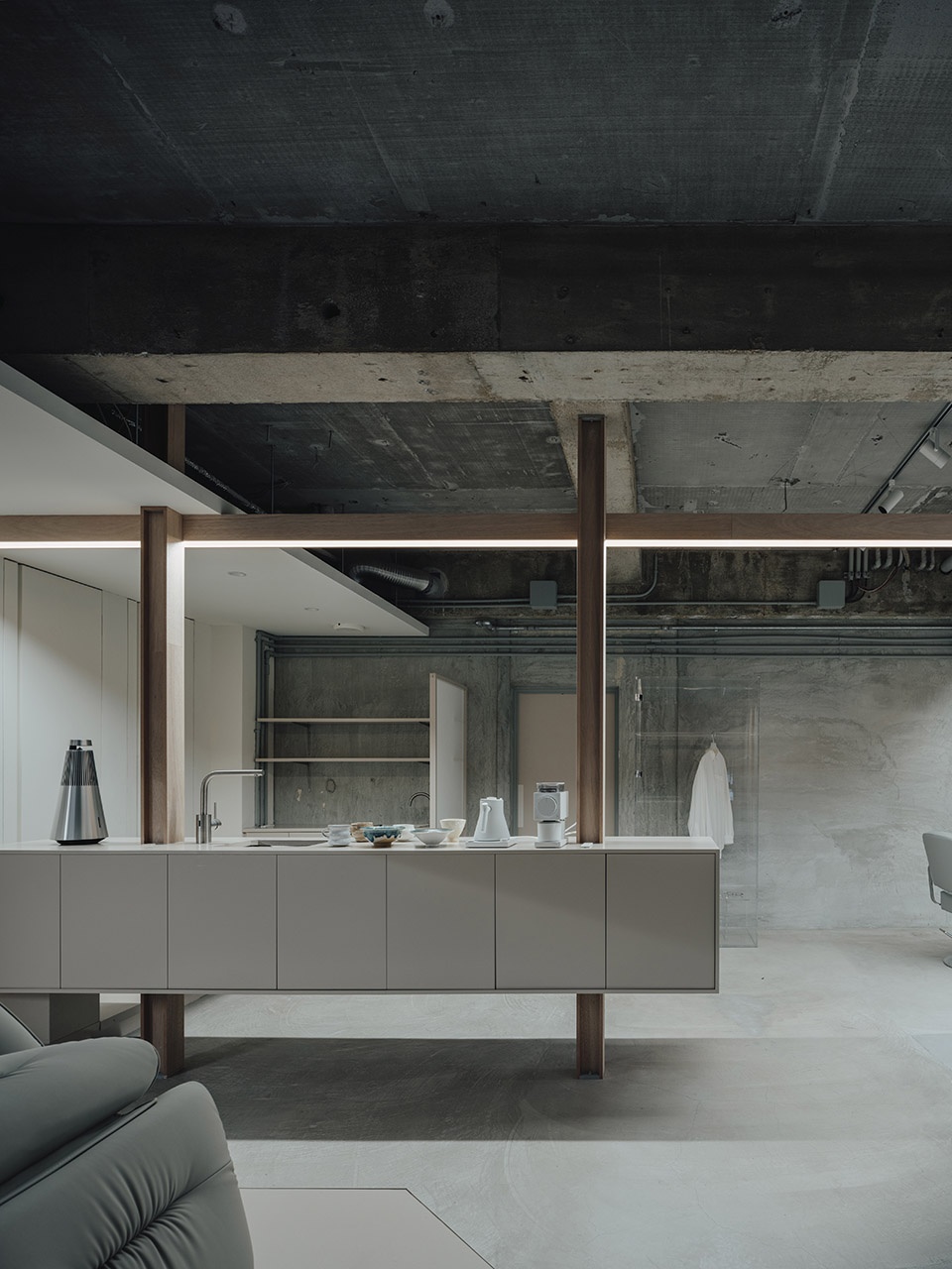 设计团队将建筑结构的“骨架”恢复至原始状态,并利用木材仿照H型钢梁的形式构建了一个H形木框架。H形凹槽中容纳了电线、插座以及照明设备等基础设施,这些装置被整合为柱与梁的结构,并贯穿整个空间。