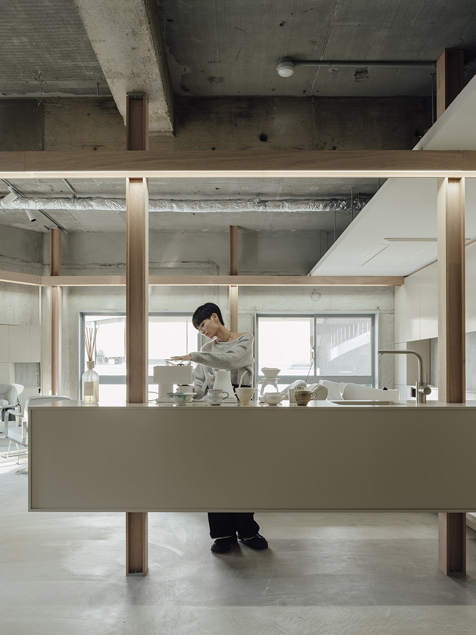 “yuqi table”的柜台由这一框架支撑,并与丈夫的剪发工位相连接。镜子悬挂在梁架之上,而镜面支架与插座则安装在柱体上。电流在框架内部循环流动,如同血液一般。设计者希望,这对生活在不同城市、从事不同职业的夫妇,能够在这里作为伴侣一同工作,并在潜意识中感受到一种如血液般流动的联系。