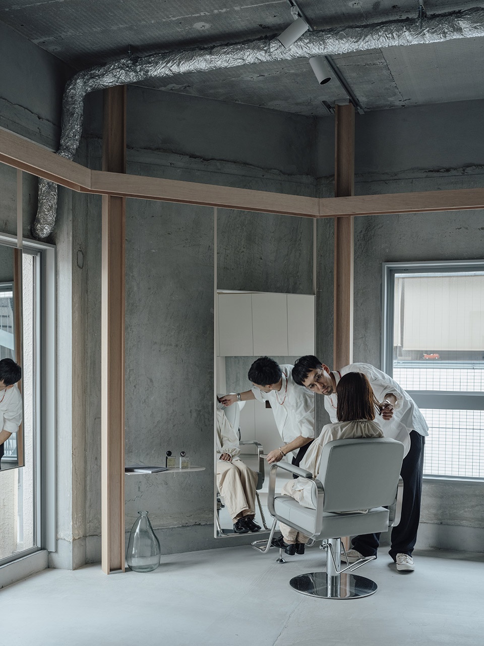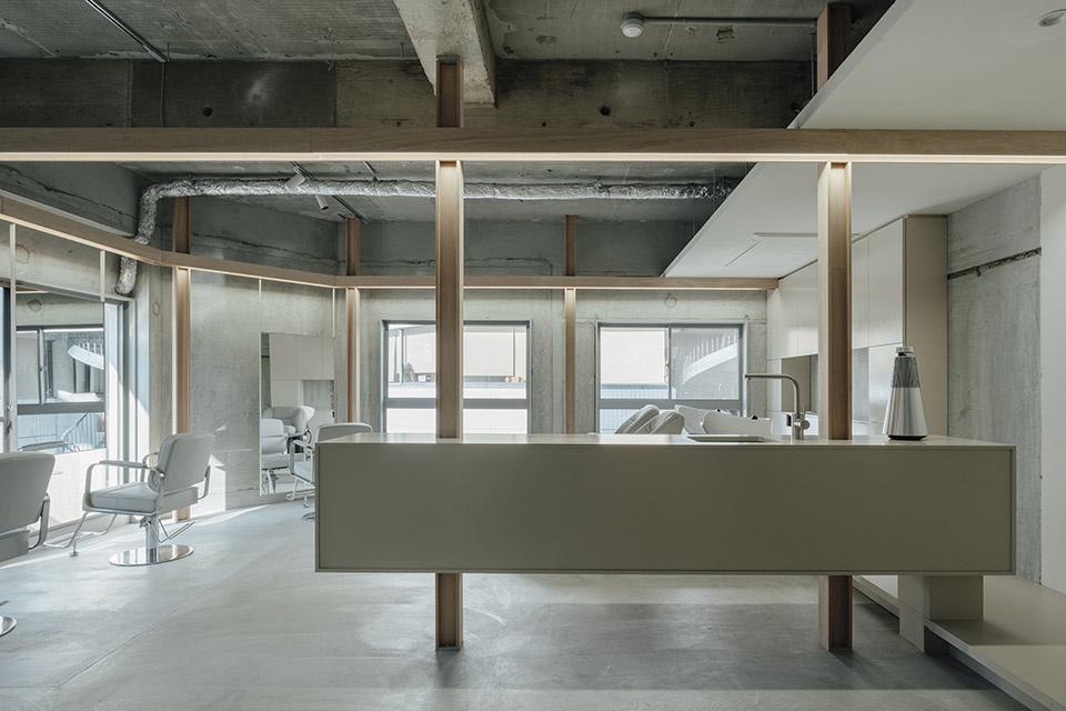 This project is for a couple who work as models and hairstylists in two locations, Tokyo and Hiroshima, to open a hair salon in Hiroshima. As they live apart from each other, they only have a short time to spend together, so they wondered if they could project the life that connects Tokyo and Hiroshima into the space of a store that is not their home.