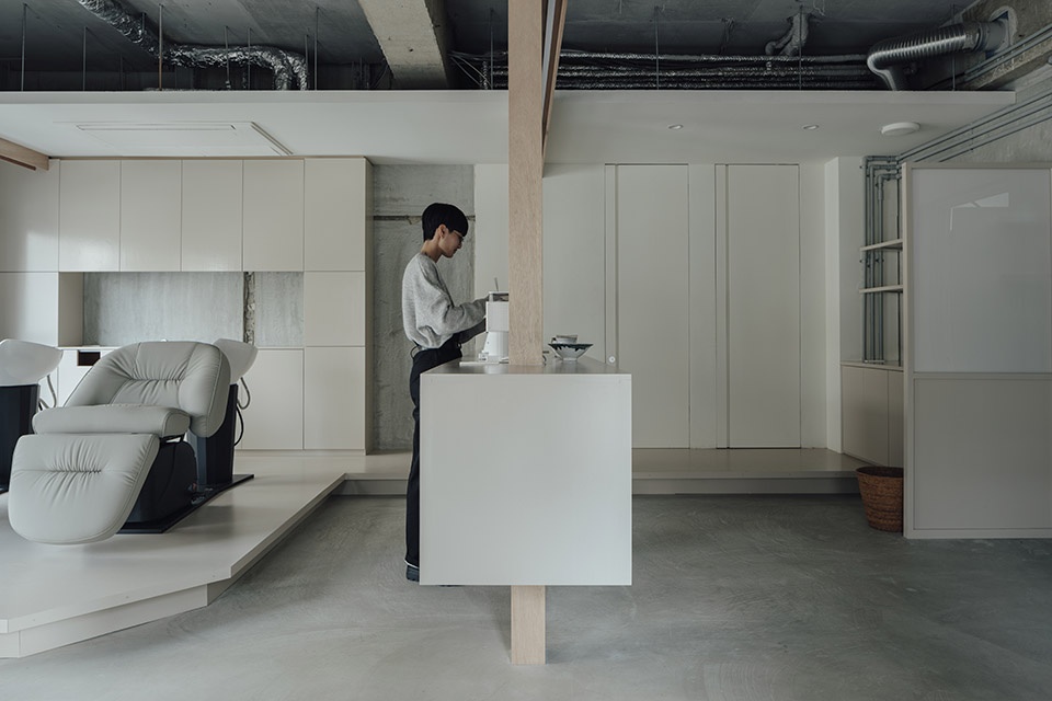 在仅有42平方米的空间中,设计团队布置了可容纳的最大数量的理发工位(四个剪发位和两个洗发位),并在入口门内侧设置了一张体量较大的接待台,使其仿佛悬浮在空间之中。这个区域被命名为“yuqi table”,以便妻子在从东京返回时,可以在这里尝试各种活动,例如举办快闪店。此外,由于狭小的空间中已经摆放了体量较大的家具,如椅子和柜台,因此衣帽间采用亚克力材料制作,以呈现透明而轻盈的视觉效果。