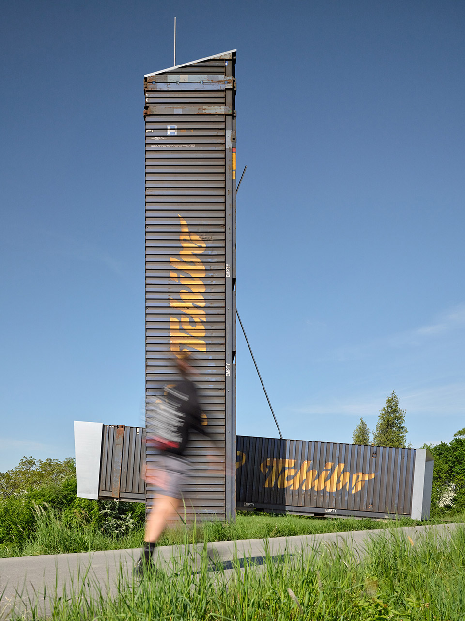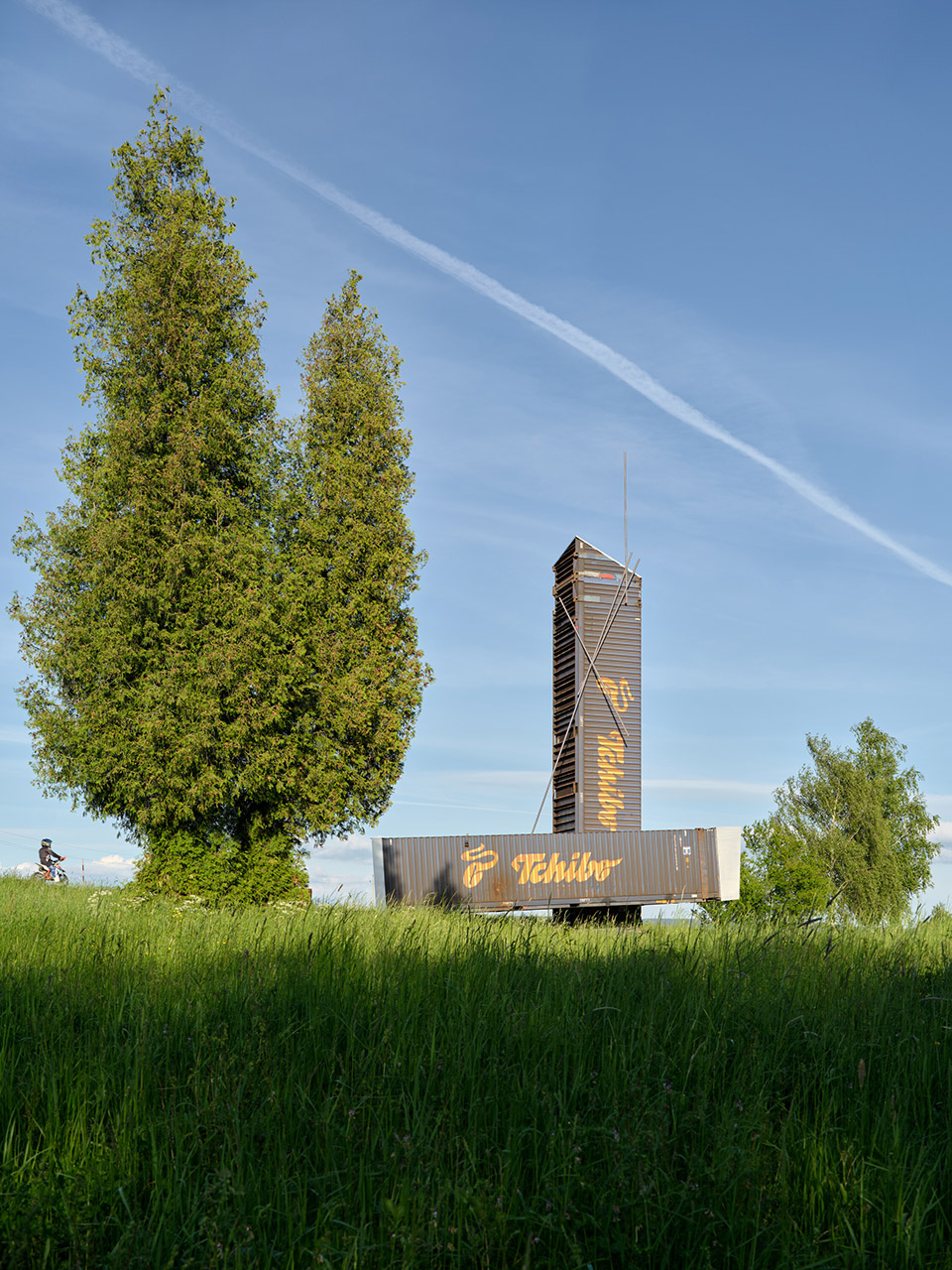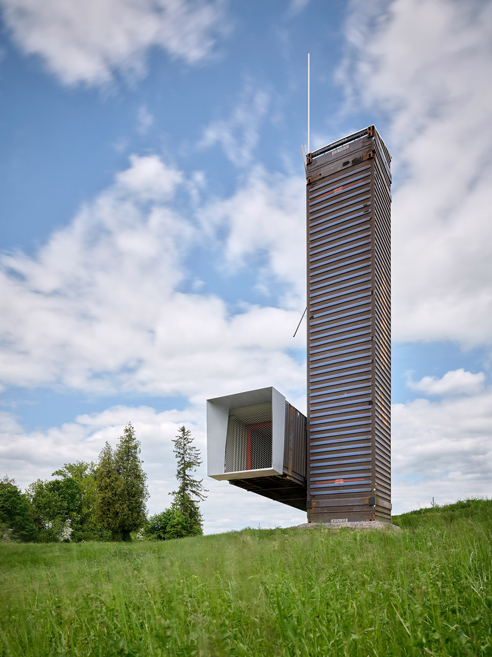 楼梯由沿周边布置的钢板折制梯梁构成,其间嵌入由钢格栅制成的踏步与平台。最终通向一个多层观景平台。不同高度与层级的观景面使得四周景观皆可观览,并兼具停留与休憩的功能。这些集装箱采用耐候钢COR-TEN制造。为保持其真实性,集装箱保留原有表面状态,未进行特别清洗或涂装,仅对新增的加固结构施加防护涂层。避雷针由奥洛穆茨雕塑家简·多斯塔尔创作,作为一件名为“米卡多”(Mikado)的艺术作品进行设计与制作。