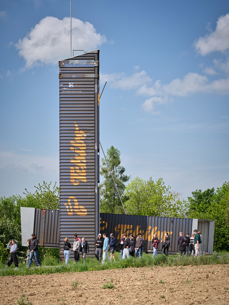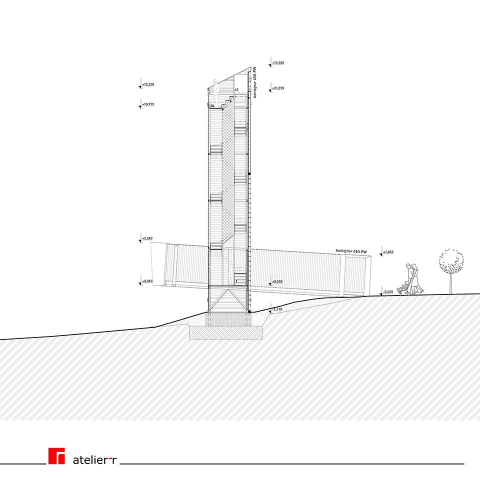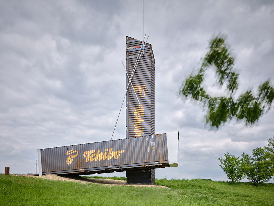 楼梯由沿周边布置的钢板折制梯梁构成,其间嵌入由钢格栅制成的踏步与平台。最终通向一个多层观景平台。不同高度与层级的观景面使得四周景观皆可观览,并兼具停留与休憩的功能。这些集装箱采用耐候钢COR-TEN制造。为保持其真实性,集装箱保留原有表面状态,未进行特别清洗或涂装,仅对新增的加固结构施加防护涂层。避雷针由奥洛穆茨雕塑家简·多斯塔尔创作,作为一件名为“米卡多”(Mikado)的艺术作品进行设计与制作。