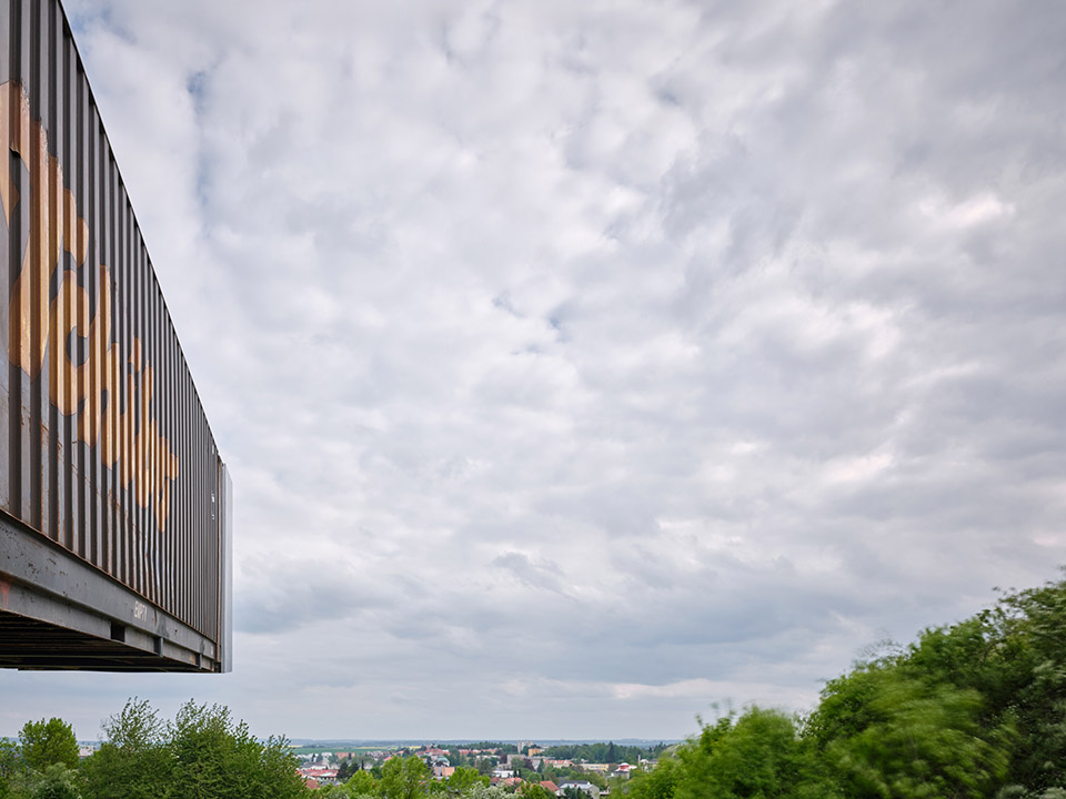 The staircase consists of perimeter steel stringers made of sheet metal, between which we inserted steps and landings made of grating. It ends with a multi-level viewing platform. The different heights and levels of the platforms allow views in all directions and provide seating. The shipping containers are made of COR-TEN – corrosion-resistant steel. To preserve authenticity, the containers were left in their original surface finish. They were not specially cleaned or painted. Coatings were applied only to the newly added reinforcing structures. The lightning conductor was designed and created by the Olomouc sculptor Jan Dostál as an artwork titled Mikado.