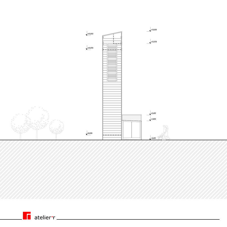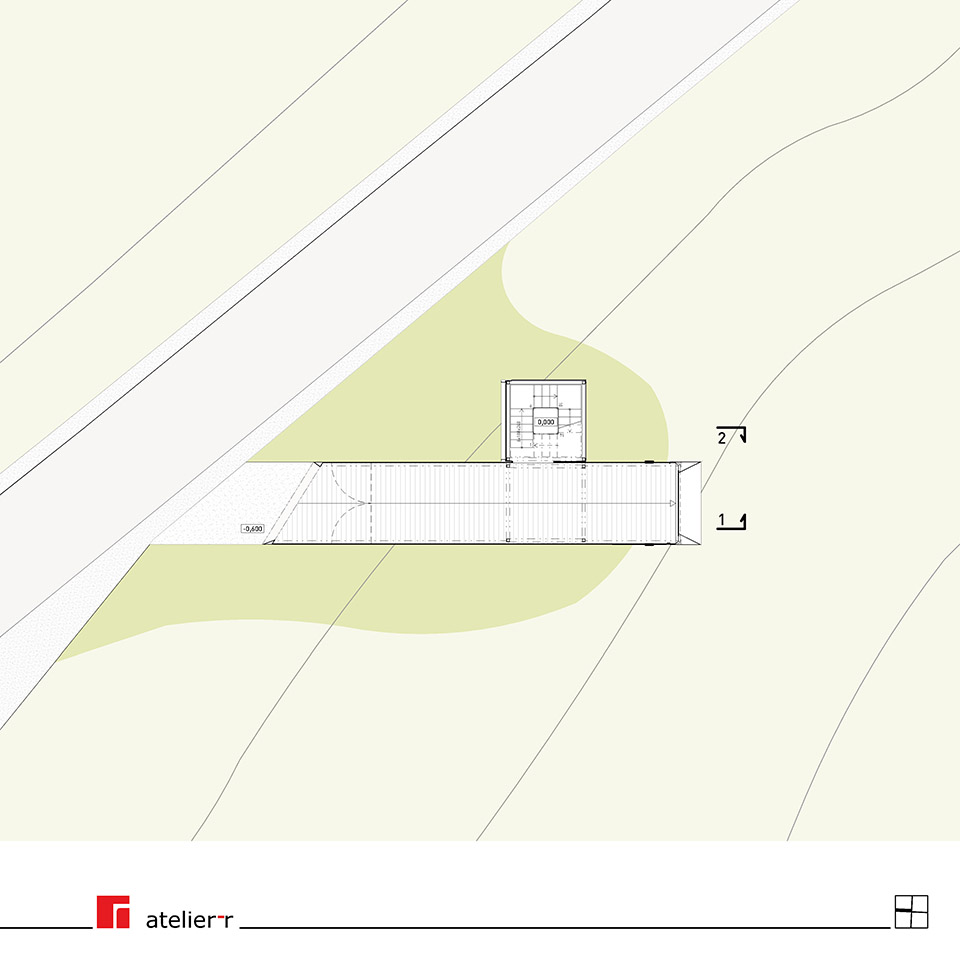 The supporting structure of the building consists of a pair of interconnected 45 ft PW shipping containers. The basic dimensions of the containers are: length 13,715 mm, width 2,550 mm, height 2,633 mm. The containers were purchased as discarded units. They are interconnected by a reinforcing steel structure made of closed steel profiles. The stability of the vertical container is ensured by an inserted steel structure, which also supports the inserted steel staircase. The horizontal container is modified by cutting the side facing the path along a plane parallel to the trajectory of the road. The shorter part is then anchored to the top of the vertical container, thereby increasing its height.