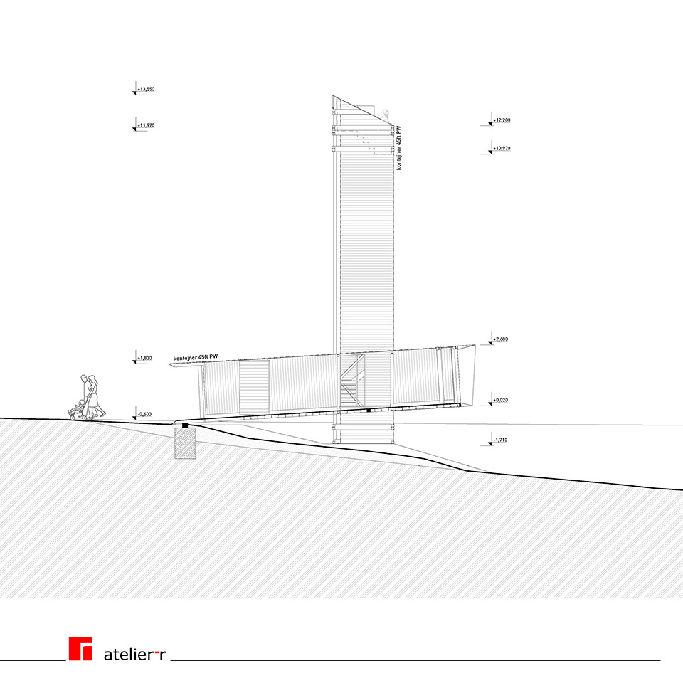 建筑的承重结构由一对相互连接的45英尺PW集装箱组成。其基本尺寸为:长度13,715毫米,宽度2,550毫米,高度2,633毫米。集装箱为购置的报废单元,并通过由封闭型钢构件组成的加固钢结构进行连接。竖向集装箱的稳定性由内部嵌入的钢结构加以保证,该结构同时支撑内部钢制楼梯。水平布置的集装箱通过沿与道路轨迹平行的平面切割其面向路径的一侧进行改造。较短的一段被固定在竖向集装箱顶部,从而增加整体高度。