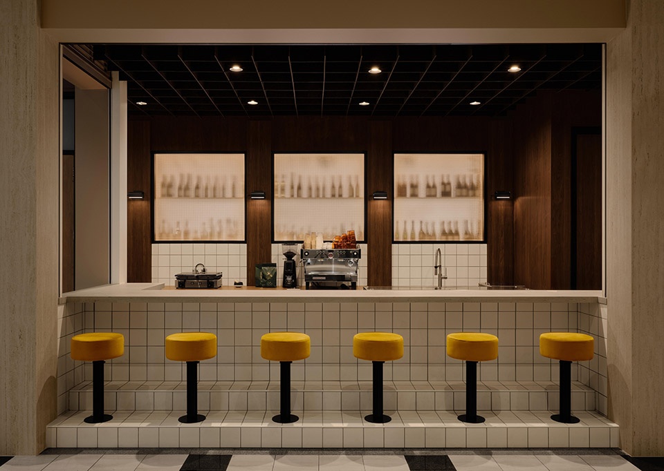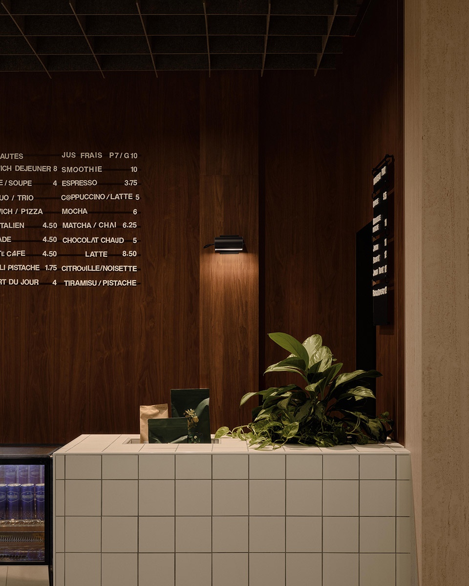 Spanning an area of approximately 2,300 square feet, the layout is organized around two distinct and complementary worlds. The Café Social, located in continuity with the common corridor, acts as a lively and accessible transitional space, bustling with activity throughout the day. The Siège Social bistro, designed as an informal ‘head office’ for the neighbourhood, opens generously onto the terrace and forecourt, encouraging meals, meetings, and gatherings. A strong material theme ensures the project’s coherence: square white ceramic tiles with a matte finish, used on both vertical surfaces and built-in furniture. Inspired by the patterns in the existing lobby, this materiality becomes an identifying and structuring motif. A walnut wall punctuated with glass openings filters the light between the café and the bistro, creating a diaphanous separation that maintains a constant visual dialogue between the spaces.